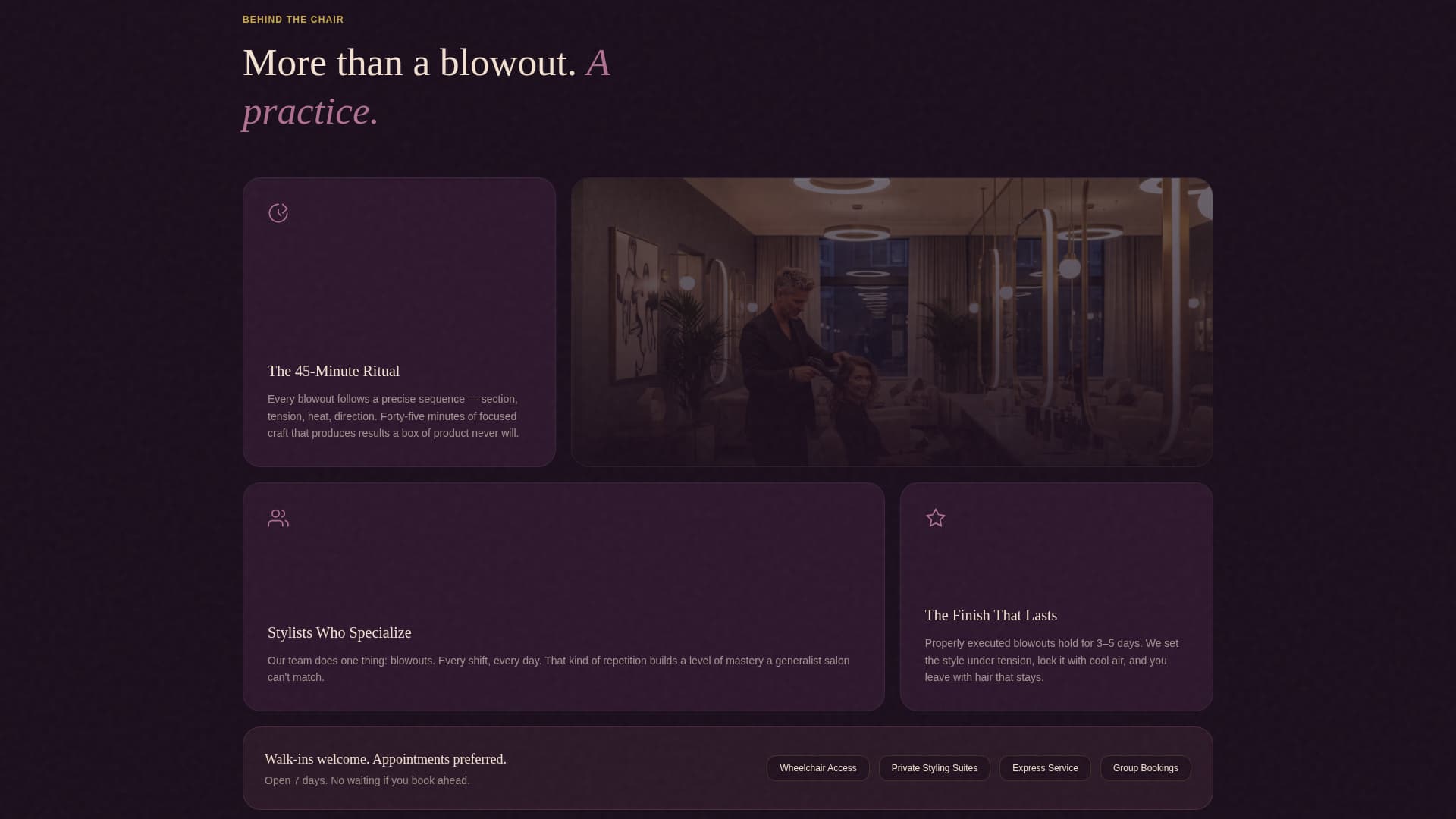 | Behind the Chair | Bento grid showing styling process and craft proof |