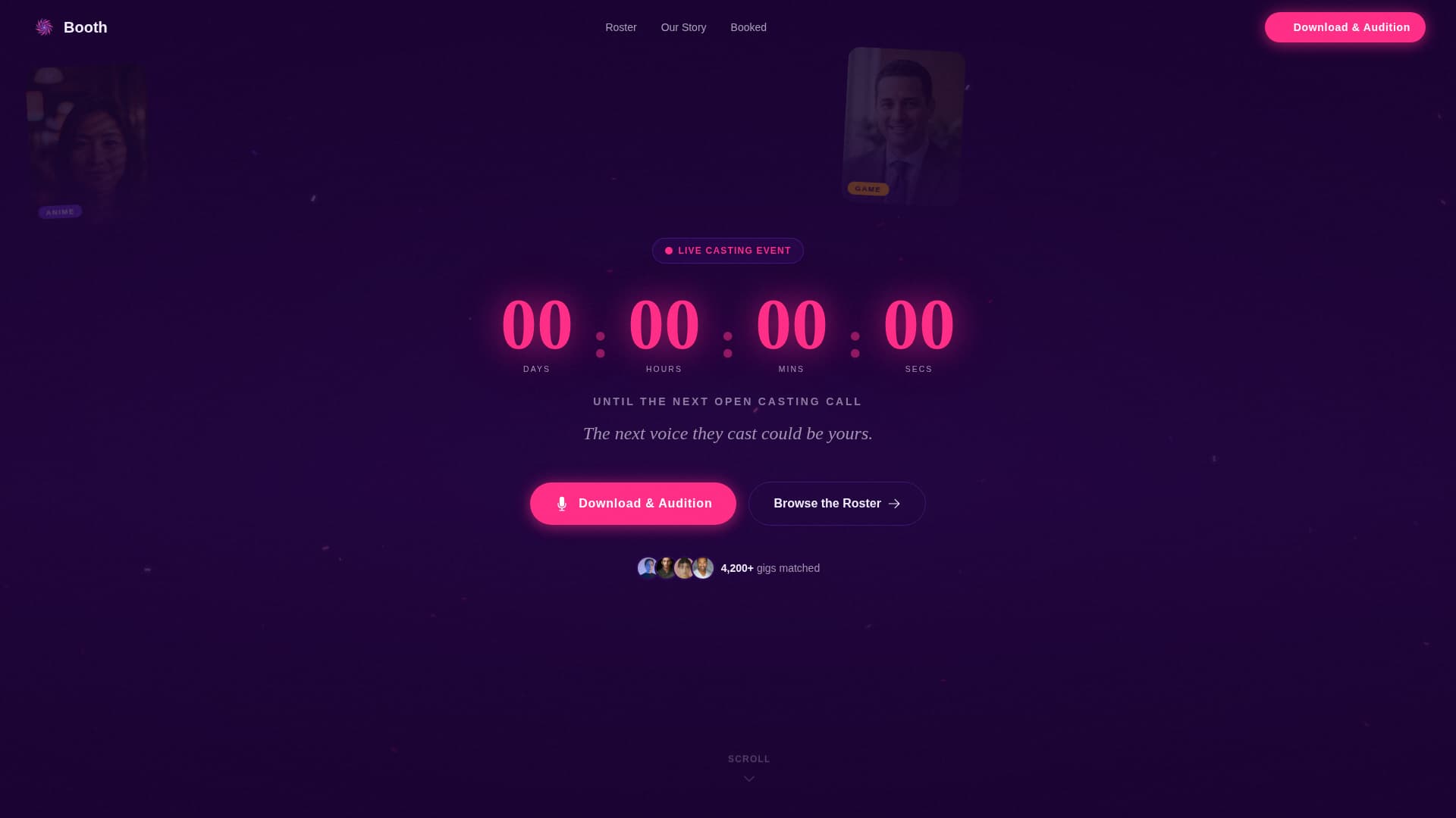 The header fills the full viewport with large neon-pink digits counting down to the next live casting call event. Behind the timer, voice actor headshots fade in and out at staggered intervals. Each headshot carries a genre badge such as "Anime," "Commercial," or "Narration." A single animated tagline appears beneath the clock to set the stakes immediately.