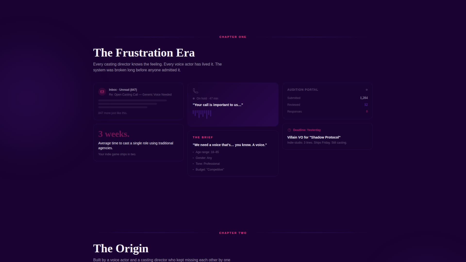 Finding the right voice for a project is slow, frustrating, and full of dead ends. Generic demo reels pile up. Emails go unanswered. Deadlines close in before the right match is made.