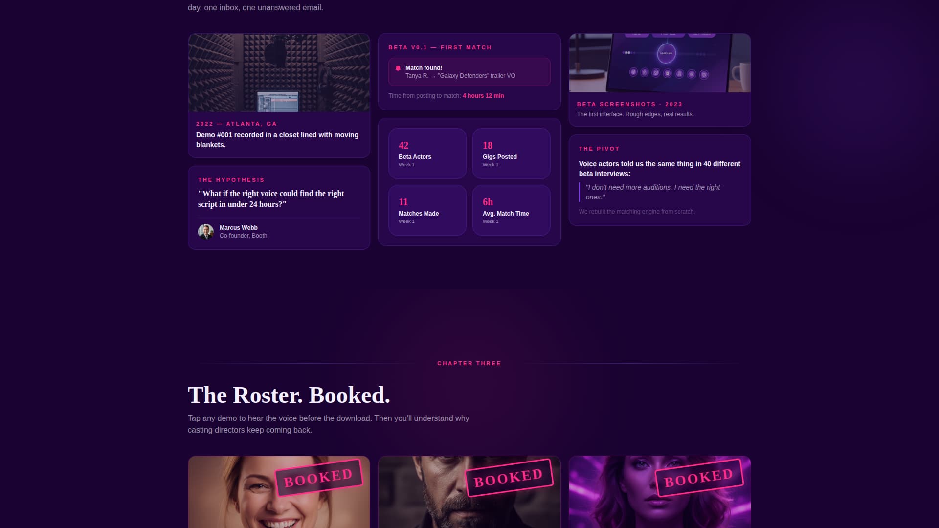 Booth is a single-page masonry landing page template designed for a voice actor talent agency. It opens with a bold countdown timer, pulls visitors through a chapter-by-chapter origin story told in shifting tile grids, and closes with a clear app download call to action. The Electric Indigo color system and Festival Energy theme make every scroll feel like backstage at a live performance.