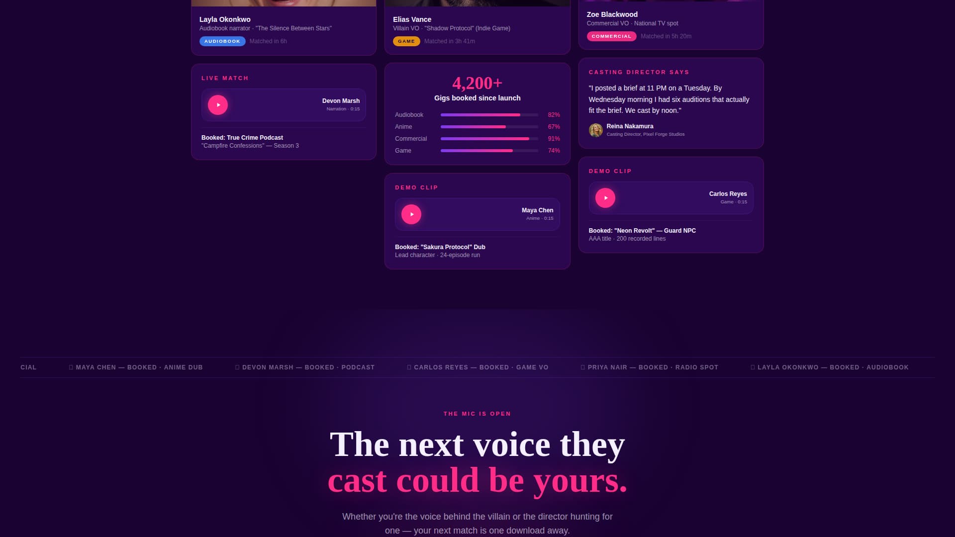 This template is built for talent agencies and entrepreneurs operating in the voice-over space. It speaks directly to the people on both sides of the casting table.