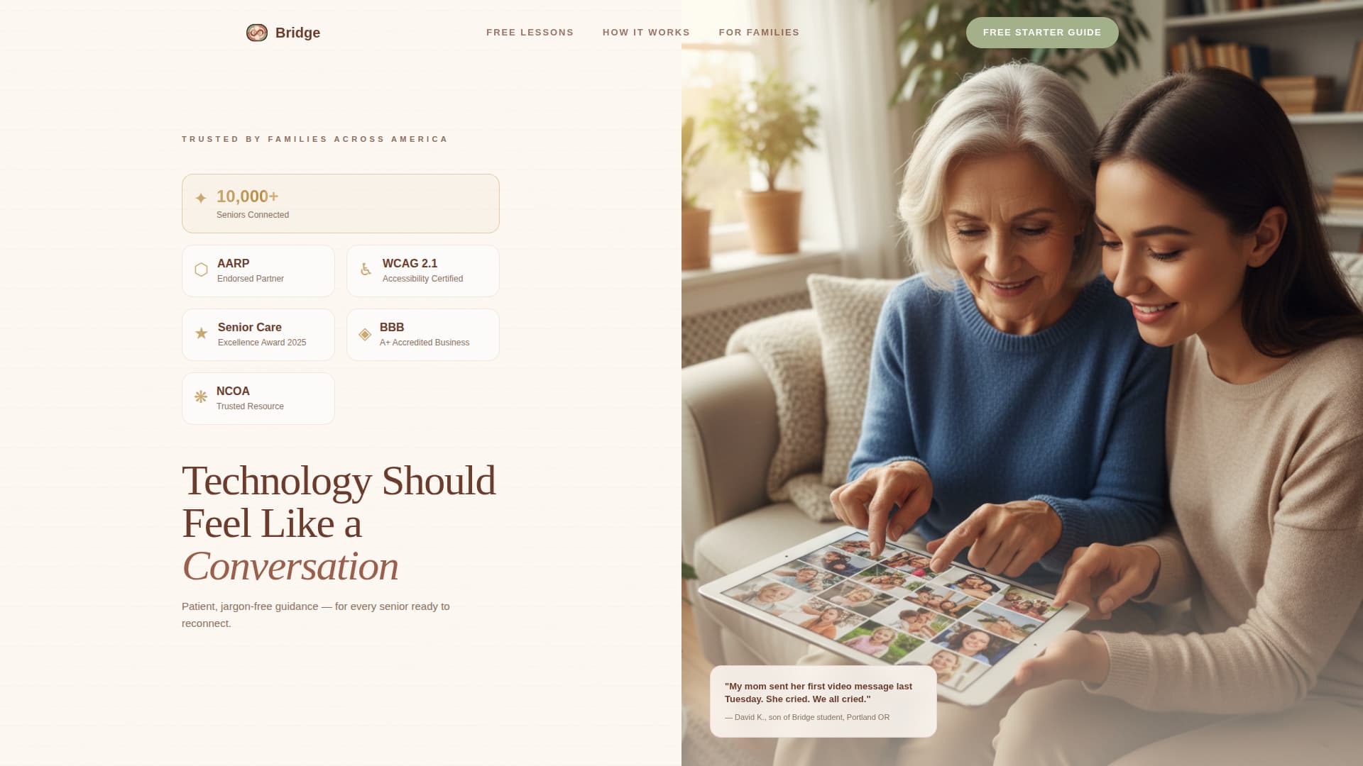 Bridge is a warm, split-screen landing page template built for senior technology training services. It combines a trust-badge header, a Vision and Mission scroll narrative, and a content-led conversion path. The Desert Rose color system and large, unhurried typography make the page feel approachable for older adults, their families, and retirement community directors alike.