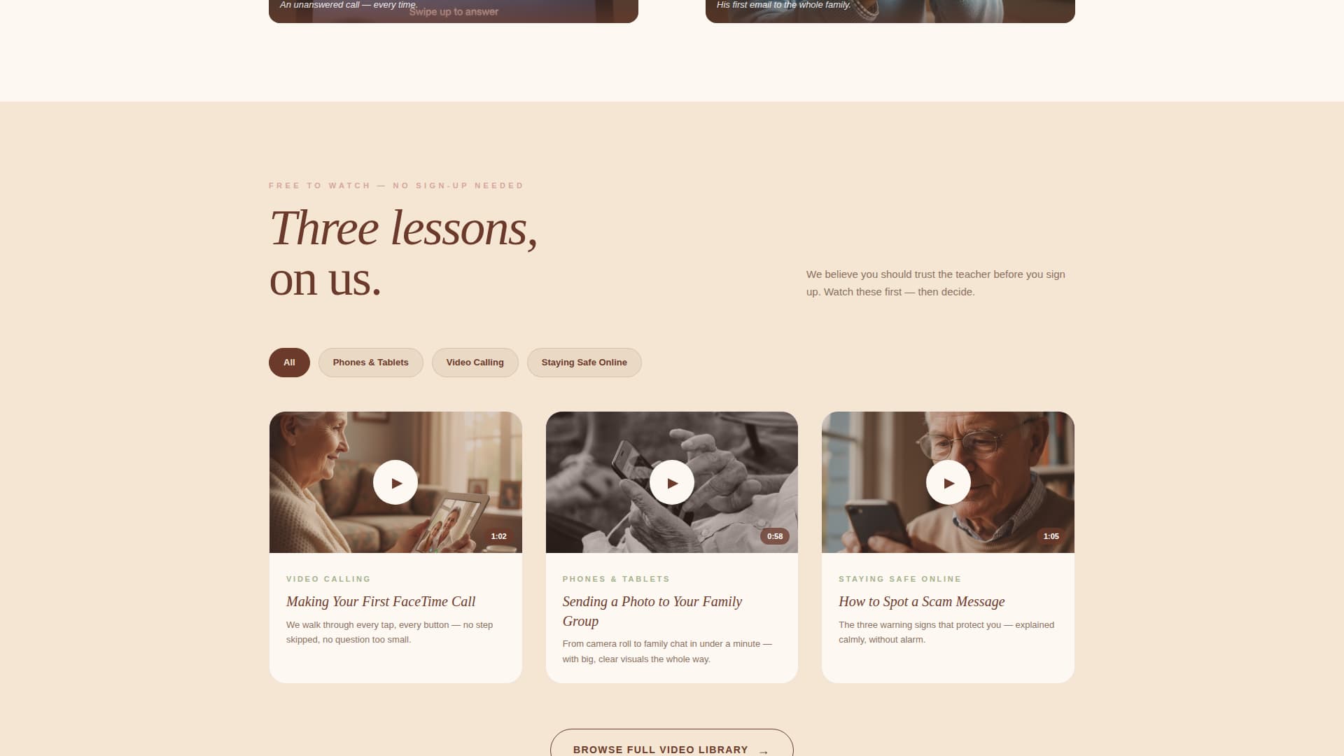A secondary call to action links visitors to a browsable library organized by topic: Phones, Tablets, Video Calling, and Staying Safe Online. This gives visitors a low-commitment next step that keeps them engaged with the content.