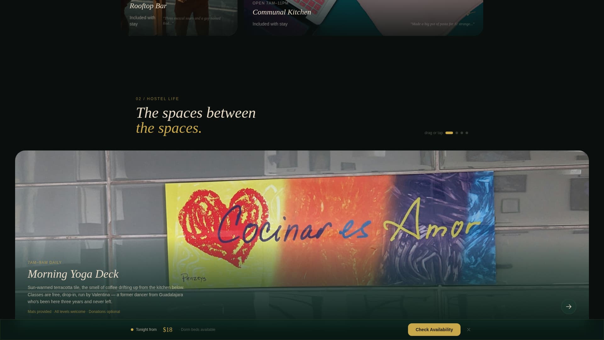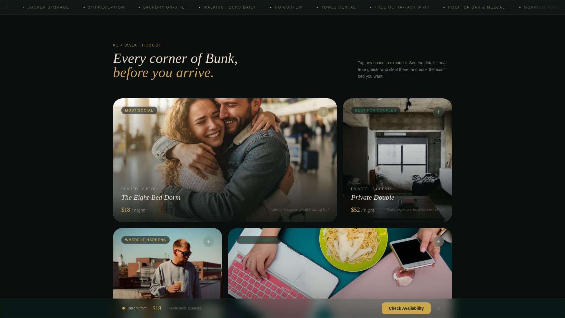 Each hostel zone, the eight-bed dorm, the private double, the rooftop bar, the communal kitchen, has its own visual micro-personality. Scroll-triggered reveals and curated image sequences make each space feel distinct as the visitor moves down the page.