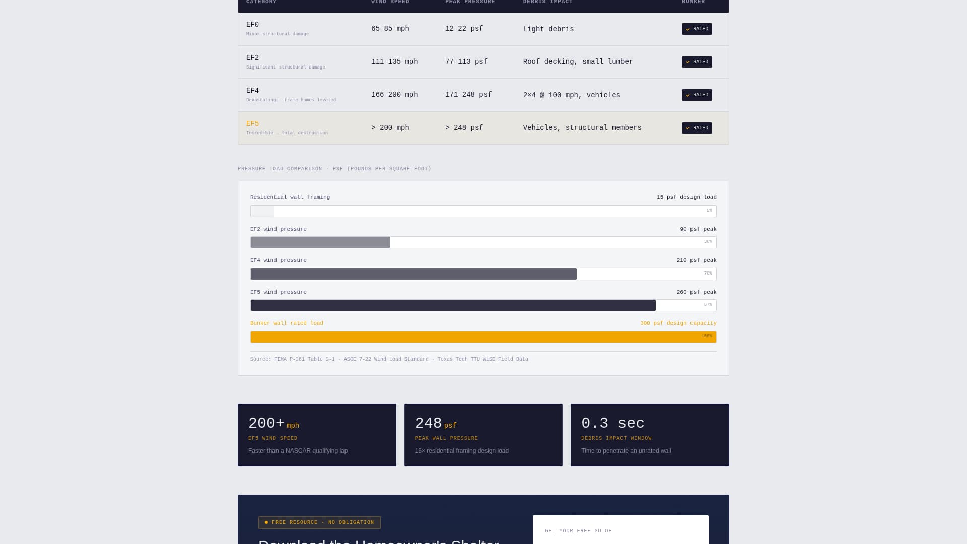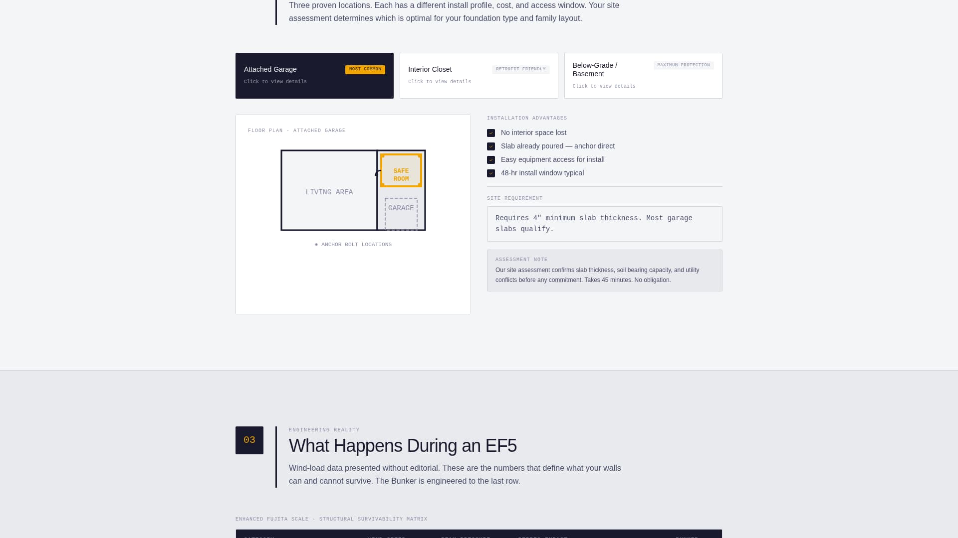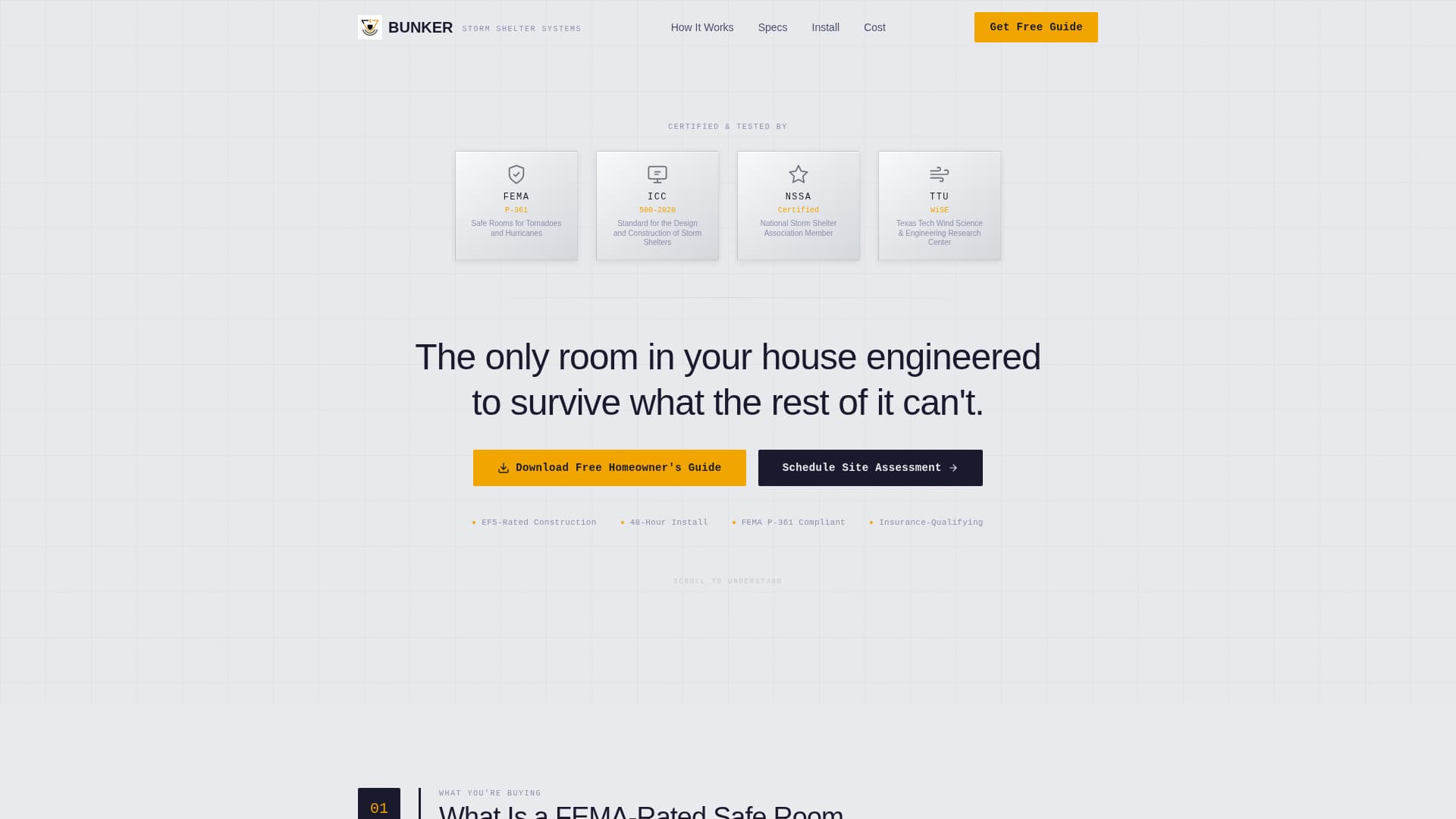 Bunker is a single-column landing page template built for storm shelter and safe room installers. It guides homeowners through a five-step educational sequence covering shelter engineering, installation placement, wind-load data, installation timelines, and cost. Two conversion paths capture leads at precisely the right moment: a guide download and a free site assessment booking form.