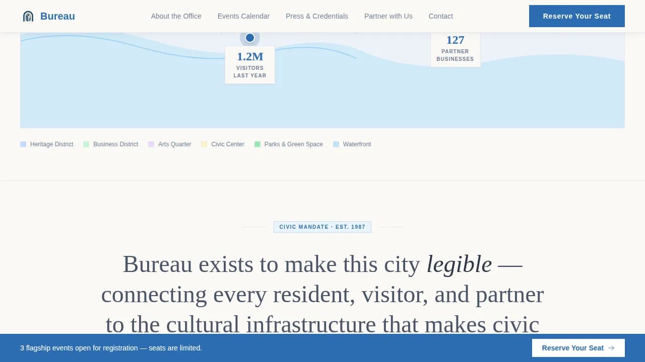 Bureau is a civic tourism landing page built to turn cultural interest into confirmed event registrations. The page opens with a living infographic map displaying verified city data, then guides visitors through a clear mandate statement, three strategic pillars, and a focused registration form. Every section narrows attention toward one goal: securing a seat at an official city event.