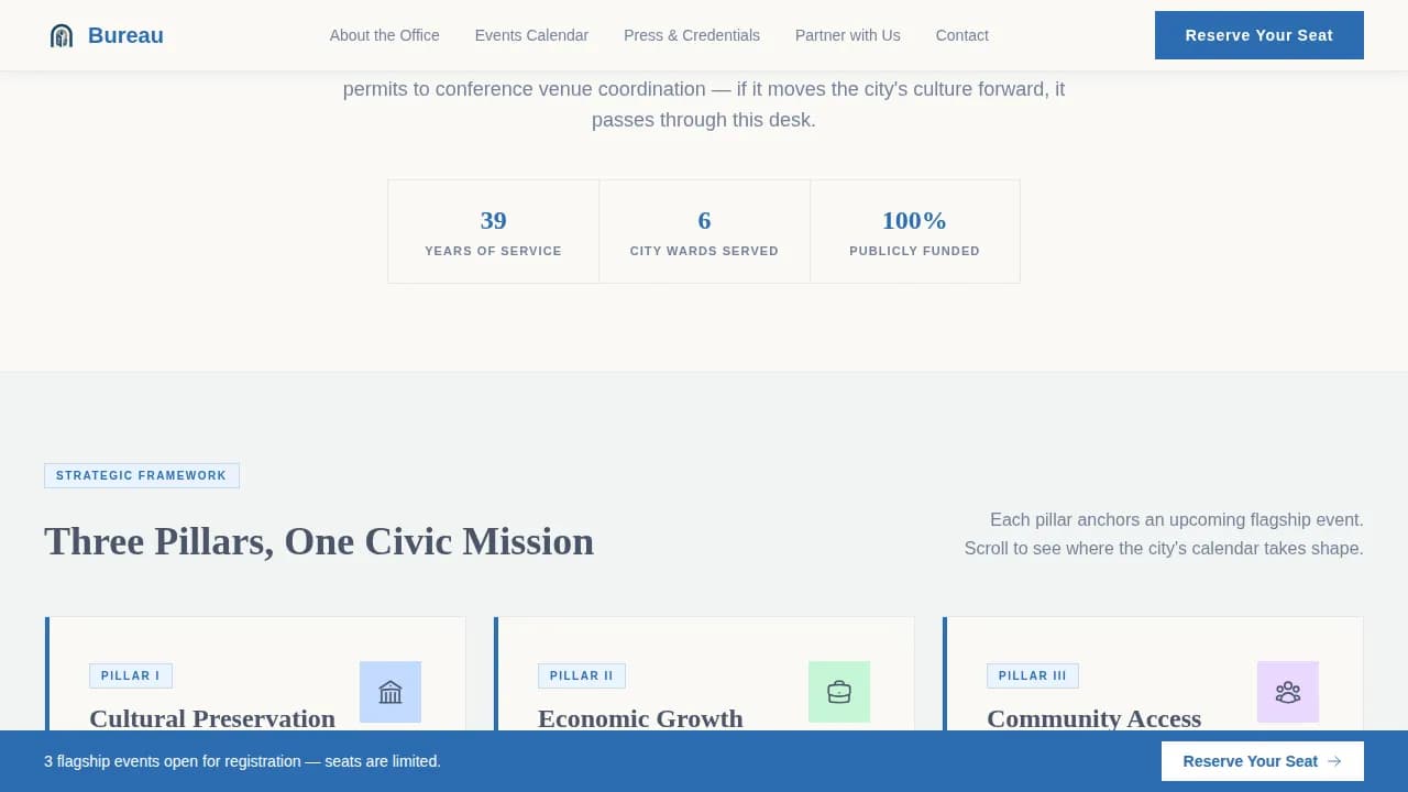 Bureau is packed with purposeful features that serve civic event organizers and the public alike. Each feature earns its place by solving a real page problem, from first-glance credibility to final form submission.