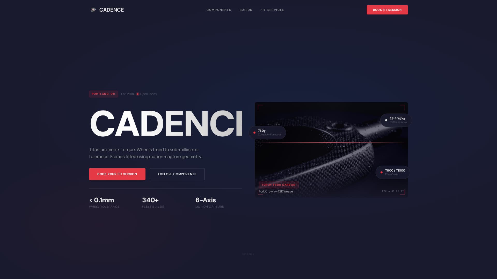 Cadence is a precision bicycle workshop landing page built for high-performance cycling businesses. It opens with a macro product demo video, flows through an interactive component gallery with expandable detail panels, and closes with a fit-session booking form and a gated spec sheet download. The design runs a Tech Glass aesthetic in a Carbon Fiber color system, engineered, dark, and fast.