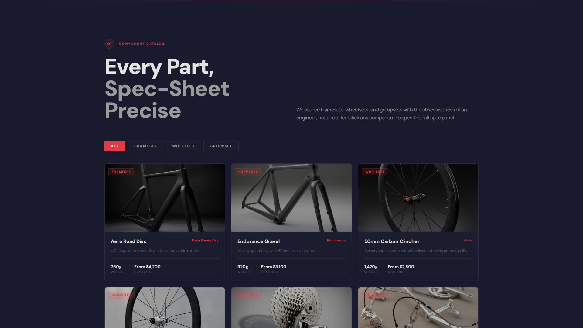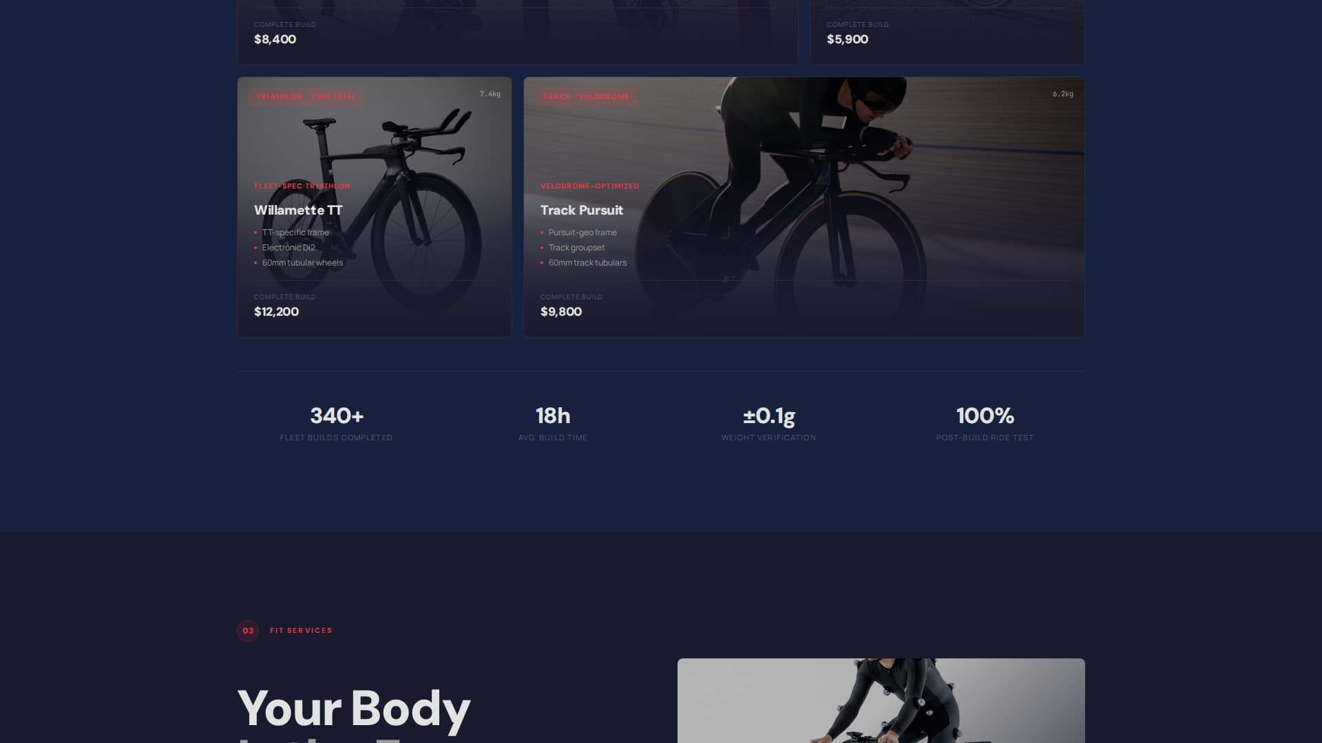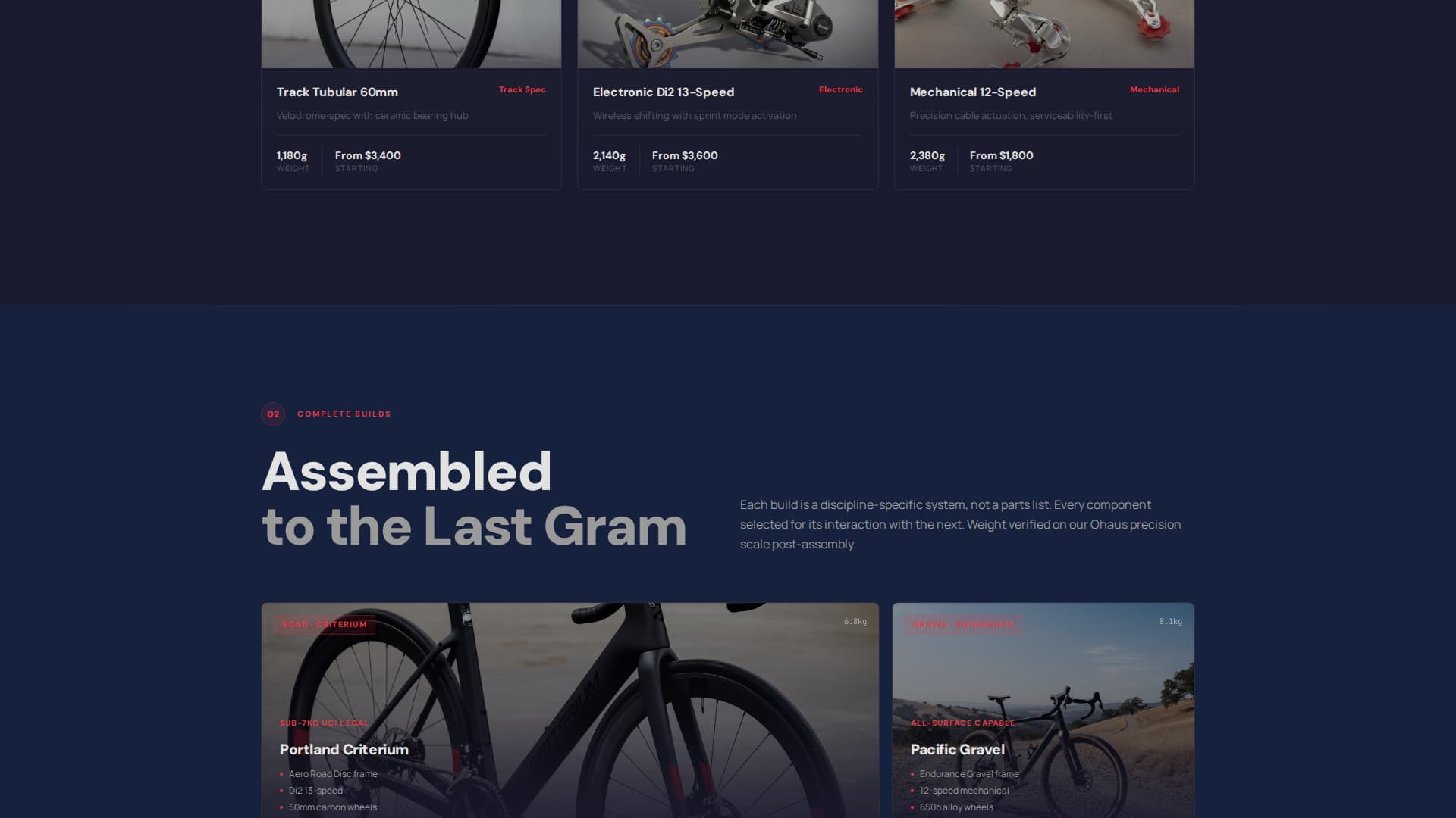 The page escalates in complexity as the visitor scrolls. It moves from individual components to complete builds to custom fitting services. This structure mimics the experience of assembling a bike piece by piece, pulling technically minded visitors deeper into the page with each section.
