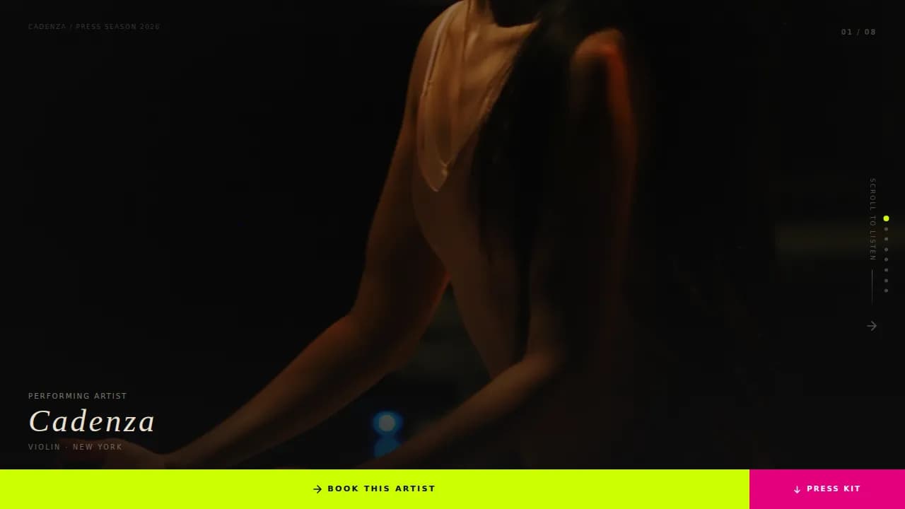 Cadenza is a single-page horizontal-scroll landing page designed for a classical performing artist. Every panel is crafted to build a case for booking before the visitor ever reaches the form. The layout draws from editorial magazine design, pairing deep black negative space with warm cream typography, electric magenta transitions, and chartreuse calls to action that reward the visitor for moving forward.