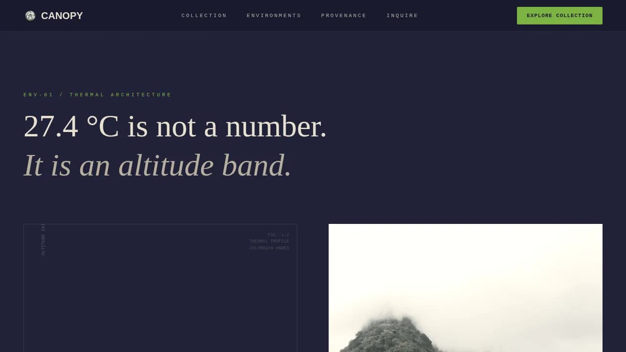 Each metric on the dashboard expands into a dedicated section as the visitor scrolls. Temperature dissolves into Colombian cloud forest altitude band mapping. Humidity reveals an animated misting diagram with droplet physics rendered like engineering schematics.