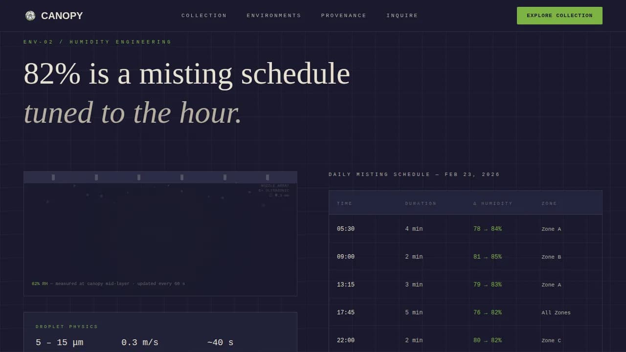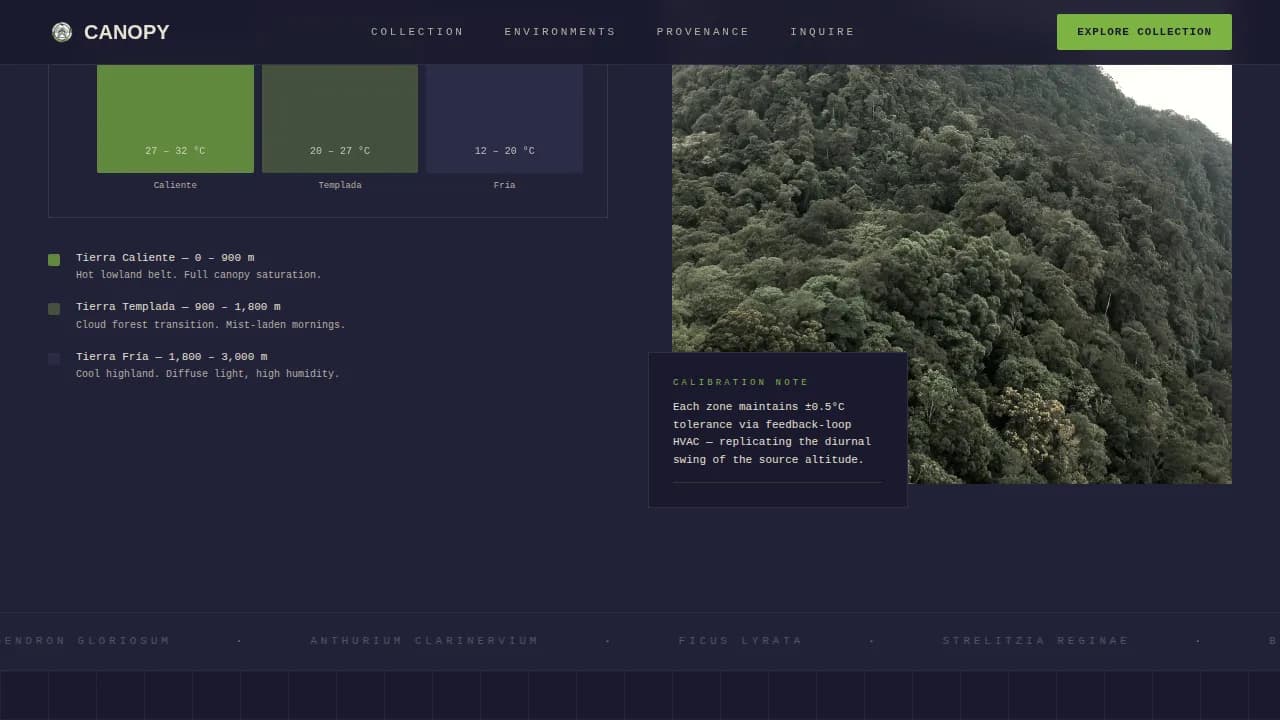 The Canopy precision engineered tropical plant greenhouse landing page template is a full-width immersive landing page built for luxury plant sourcing businesses. It opens with a live climate-data dashboard, then guides visitors through thermal zones, misting diagrams, specimen collections, and a provenance story. The design merges engineering precision with organic warmth to turn serious buyers into catalog browsers.