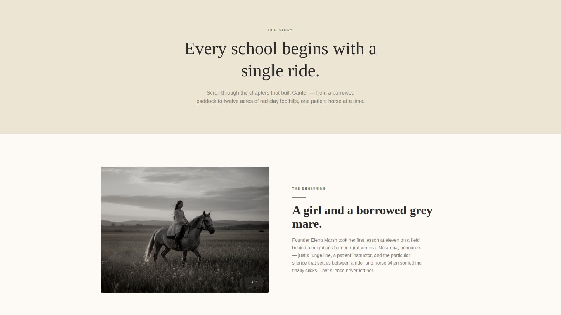 Canter is a single-page equestrian landing page template built for horse training schools. It uses an origin story structure, a zigzag alternating layout, and a warm Japanese Zen color palette to guide first-time visitors toward booking a Discovery Ride. Every section advances a narrative, ending with a clear lead-generation form.