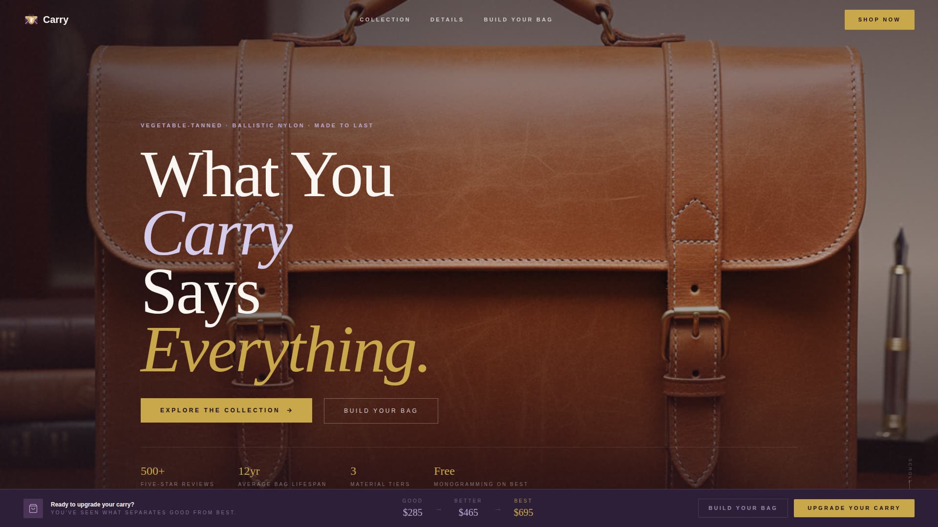 Carry is a single-page template for premium briefcase and laptop bag brands. It opens with a still, atmospheric header photograph and unfolds like a luxury unboxing ritual as the visitor scrolls. A tiered product display, macro-detail photography panels, and a three-step bag configurator make the quality case visually before any price is mentioned.
