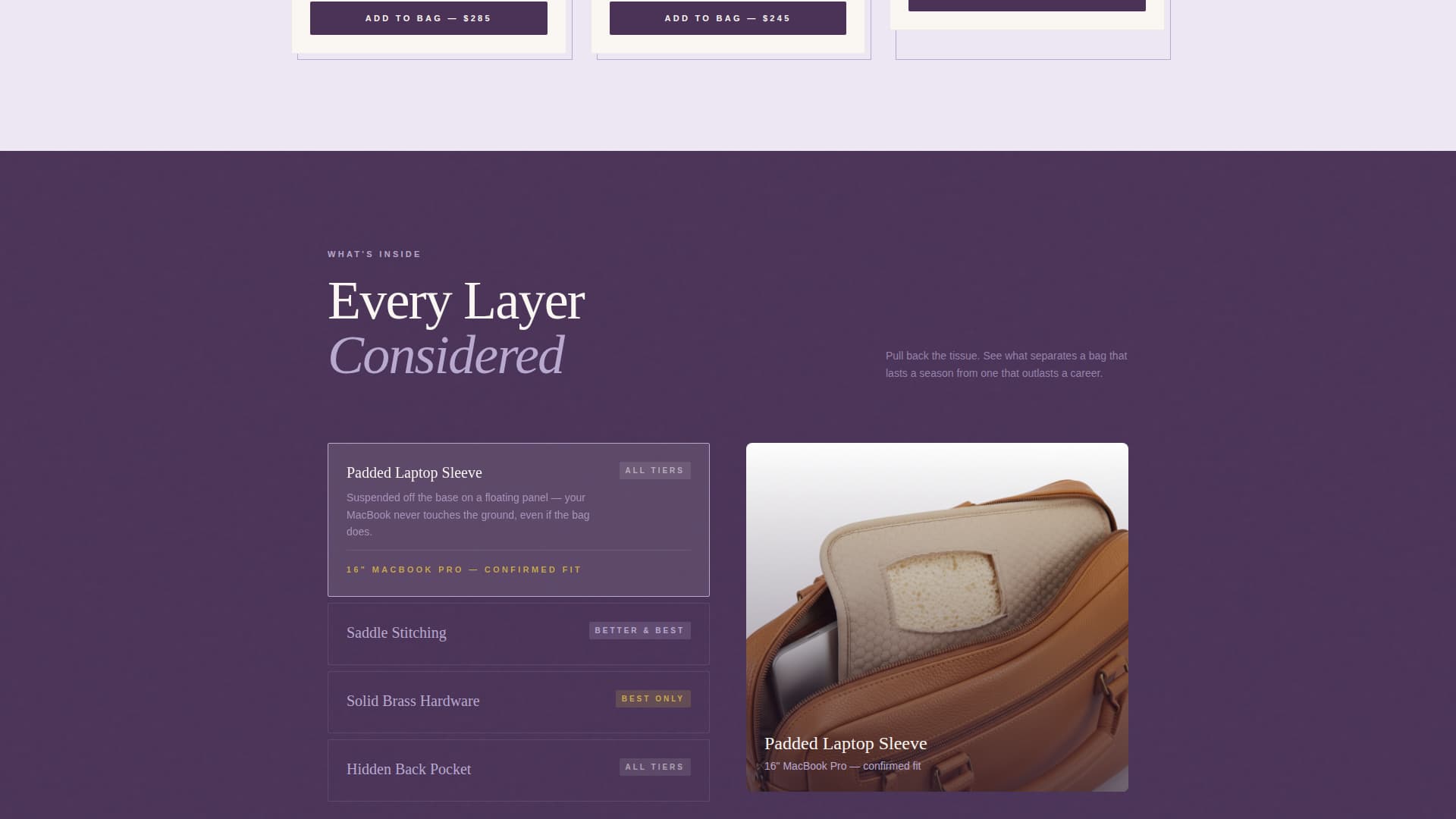 Every product card includes a three-state toggle showing the base model, the leather upgrade, and the monogrammed edition. Price steps are visible at each tier, letting visitors compare value before clicking. Macro-zoom stitching comparisons between tiers make quality differences visible and undeniable.