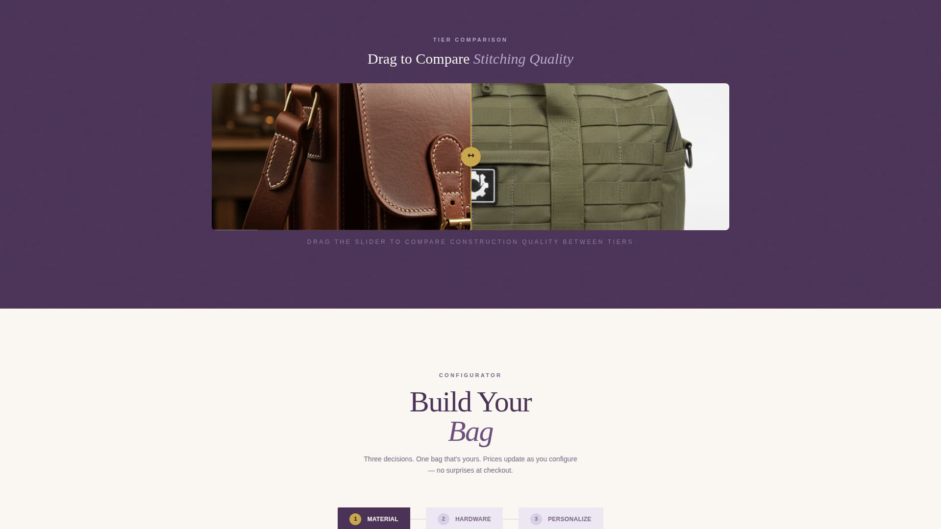 | Bag Configurator | Guide visitors through a three-step material, hardware, and personalization builder |
