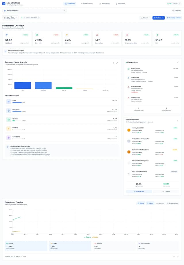This email marketing dashboard provides a complete overview for managing your campaigns and growing your audience. Easily track key performance metrics like total revenue, subscriber growth, and campaign engagement rates. The platform helps you analyze results, monitor recent activity, and gain valuable insights to optimize your strategy.