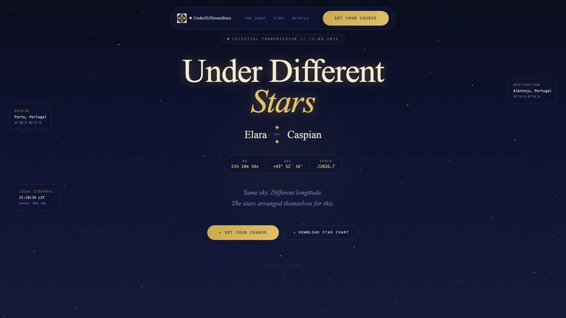 Celestial is a dreamy destination wedding landing page template inspired by astronomy and antique celestial cartography. It frames two people from different corners of the world meeting under the same stars. Deep navy blue, warm gold, and parchment create a rich, intimate setting for every section of the wedding invitation experience.