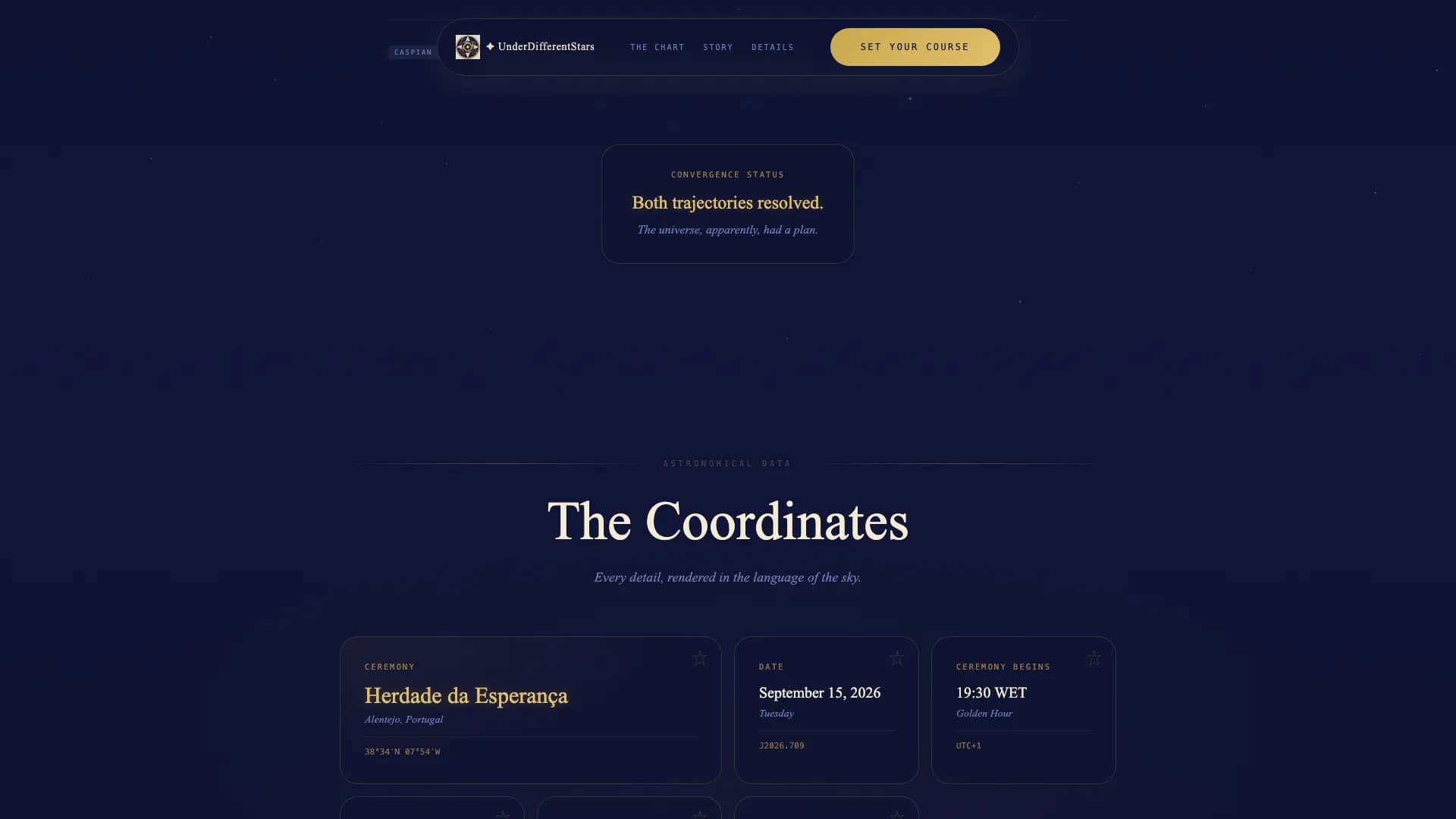 Stars drift slowly across the screen. The constellation draws itself as each section enters view. These motion details are subtle enough not to distract but consistent enough to board the guests in the visual world from arrival through RSVP.
