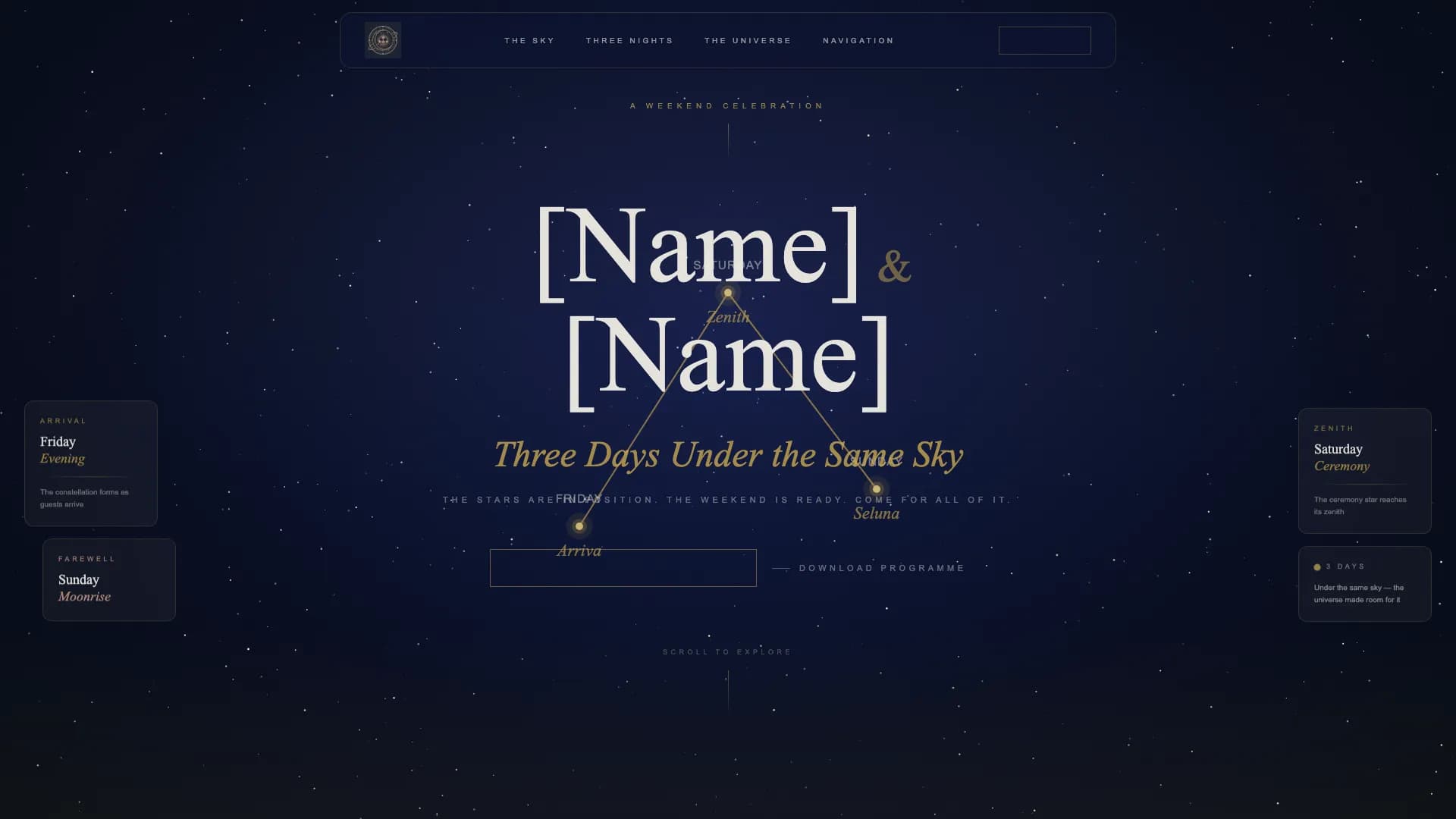 Celestial is a single-column wedding landing page built for three-day celebrations under an open sky. It pairs antique star-atlas aesthetics with practical guest logistics, guiding your husband-to-be and you through a full weekend of cosmic events. Stars, constellations, and a layered day-by-day schedule make every guest feel the scale of the celebration.
