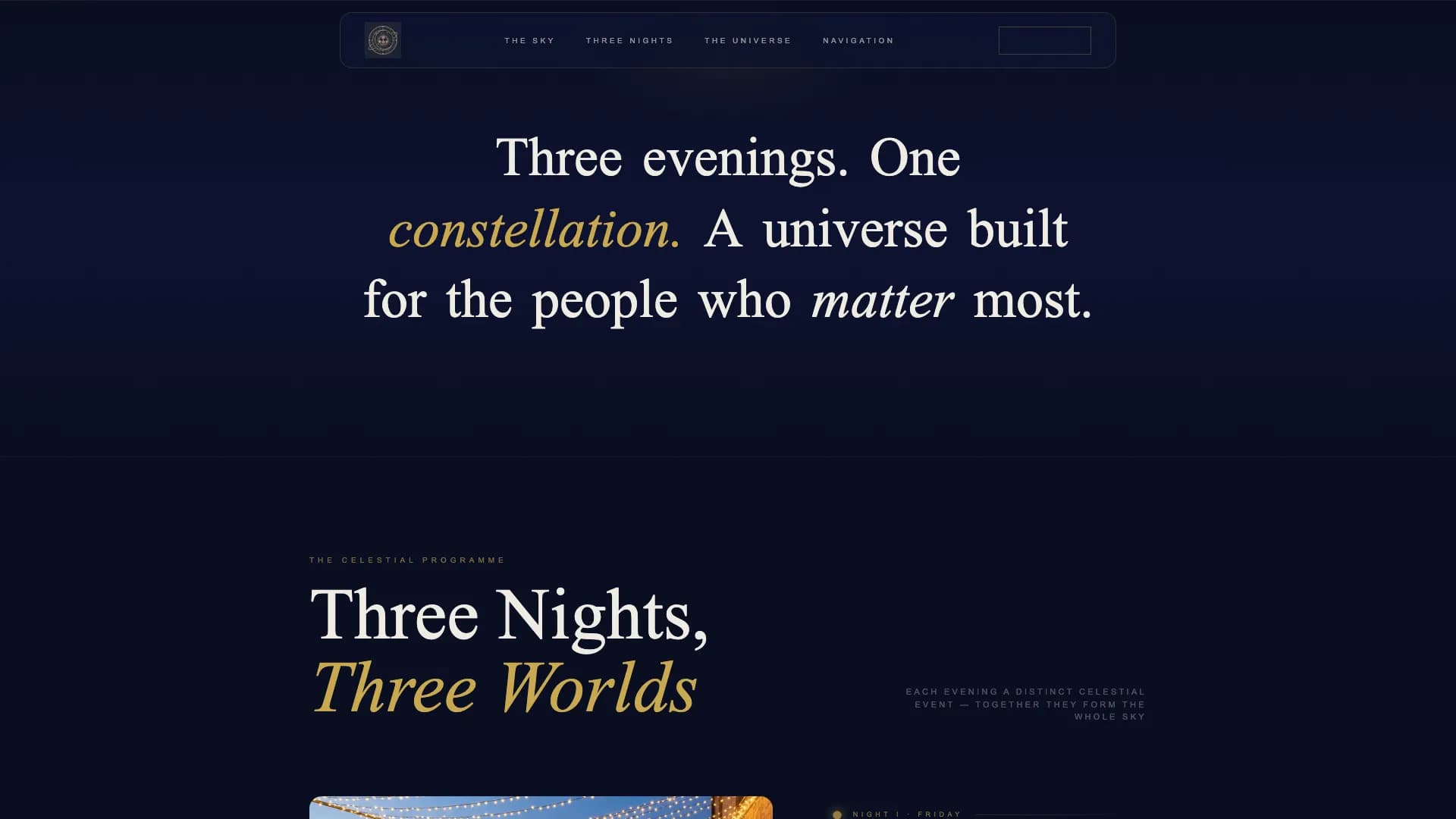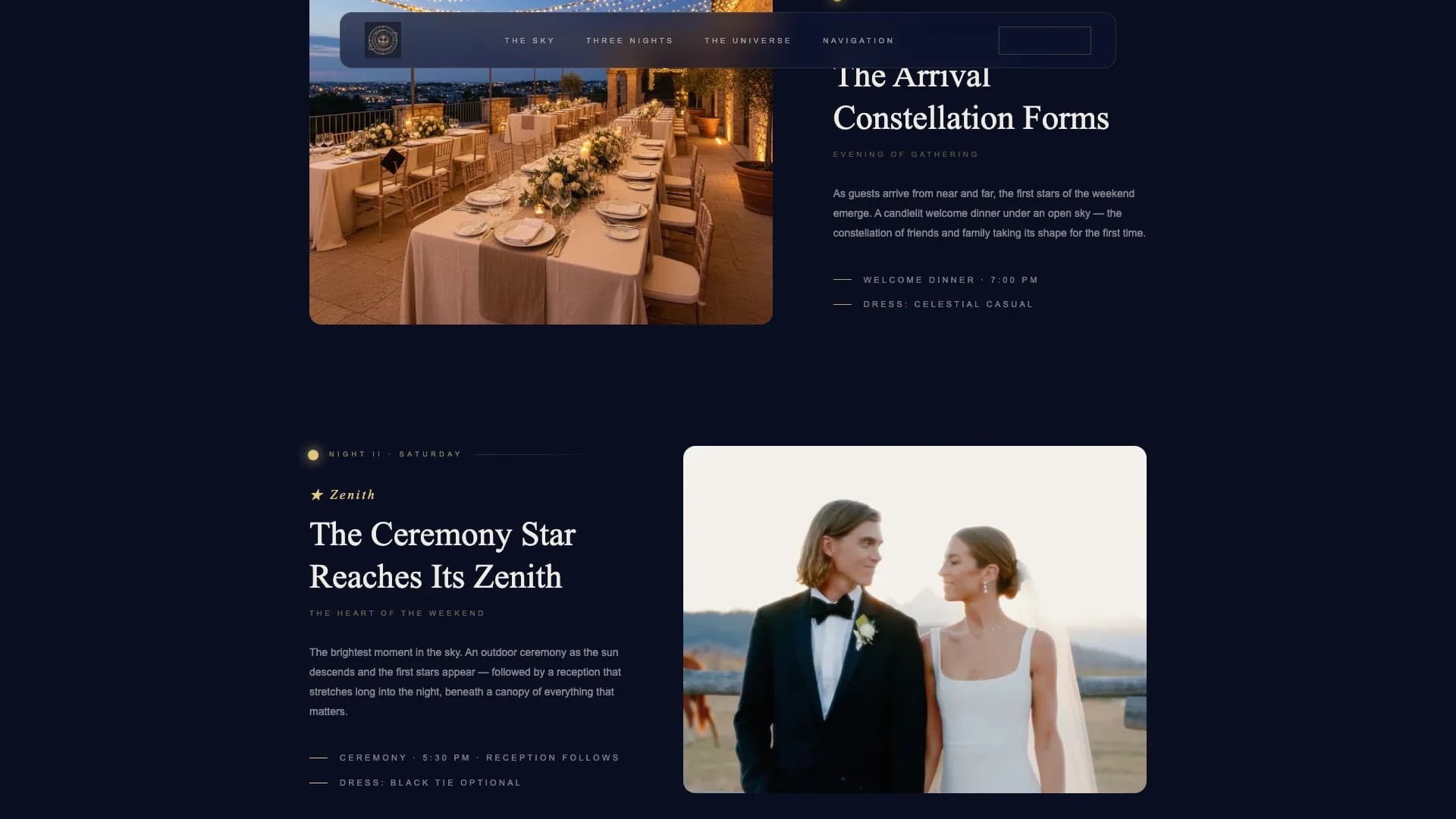 A three-day celestial-themed wedding requires a landing page that combines ethereal aesthetics with detailed logistics. Guests need clear timelines, travel details, and daily schedules without losing the emotional atmosphere.