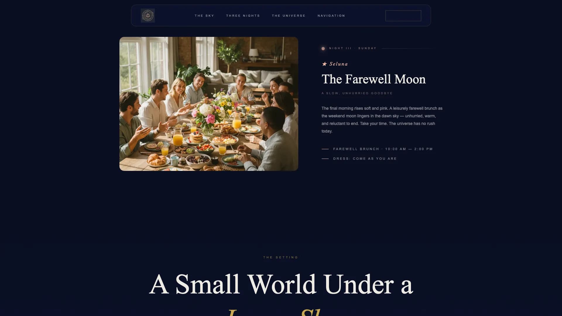 Each evening is framed as its own celestial event. The layered schedule gives guests a clear chronological breakdown, from the arrival constellation on Friday to the farewell moon on Sunday.