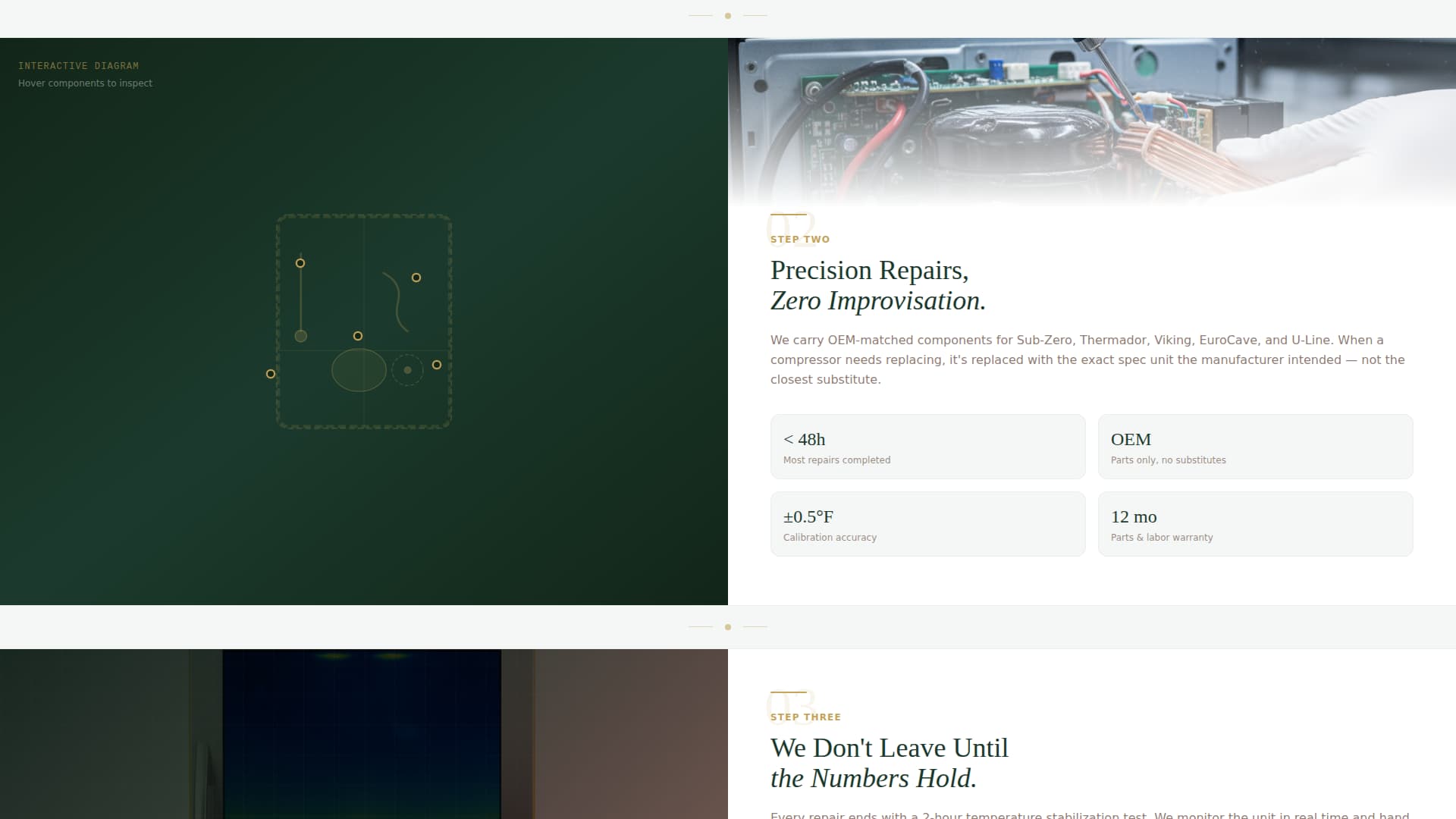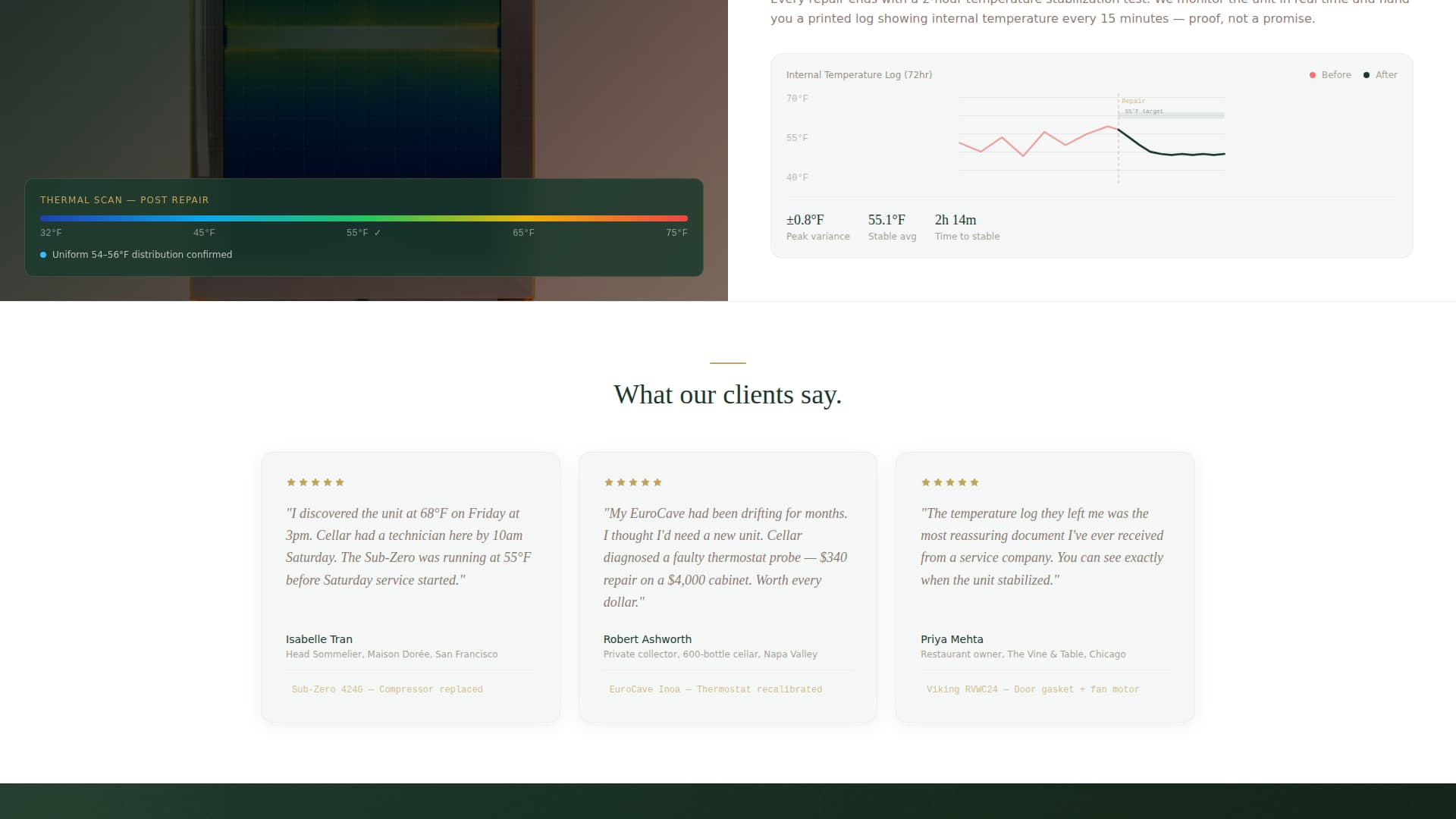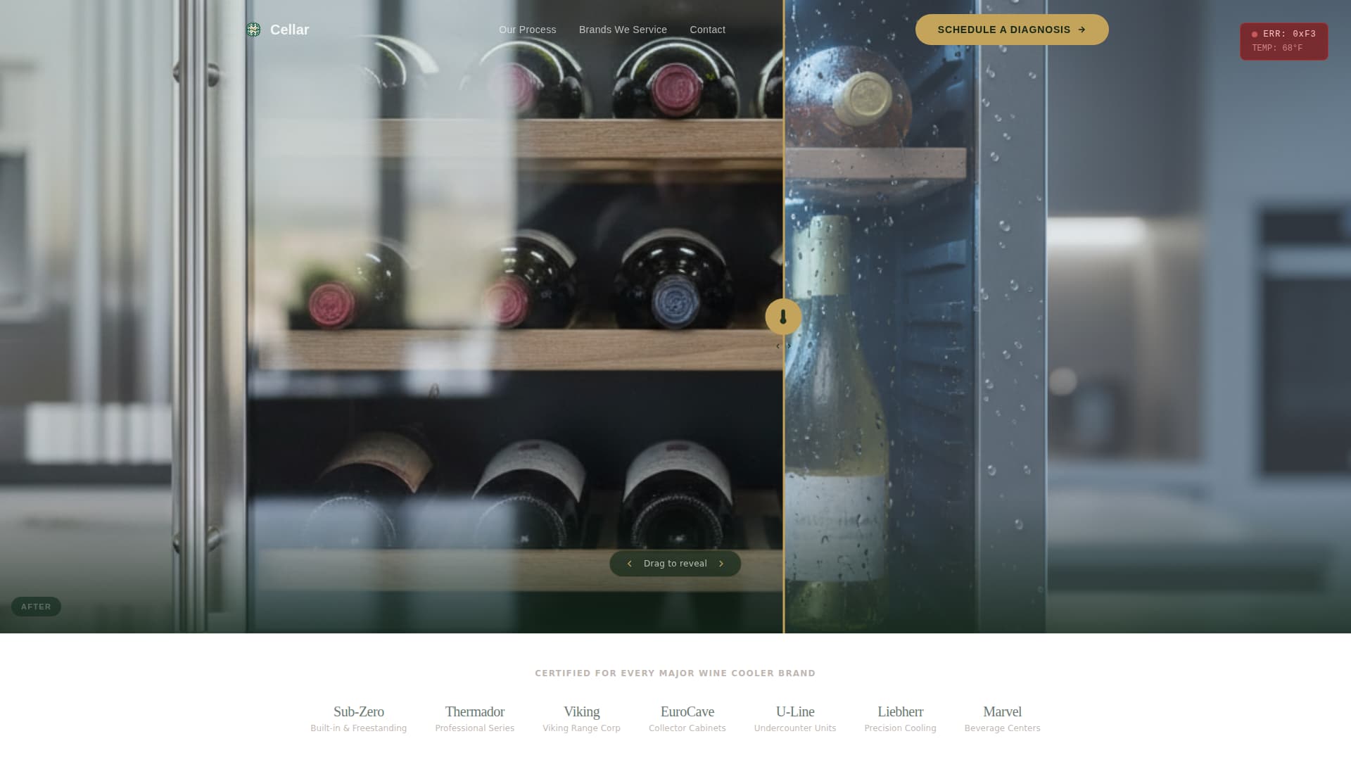 | Before/After Slider Header | Opens with a visual contrast between a failing and a restored wine cooler unit |