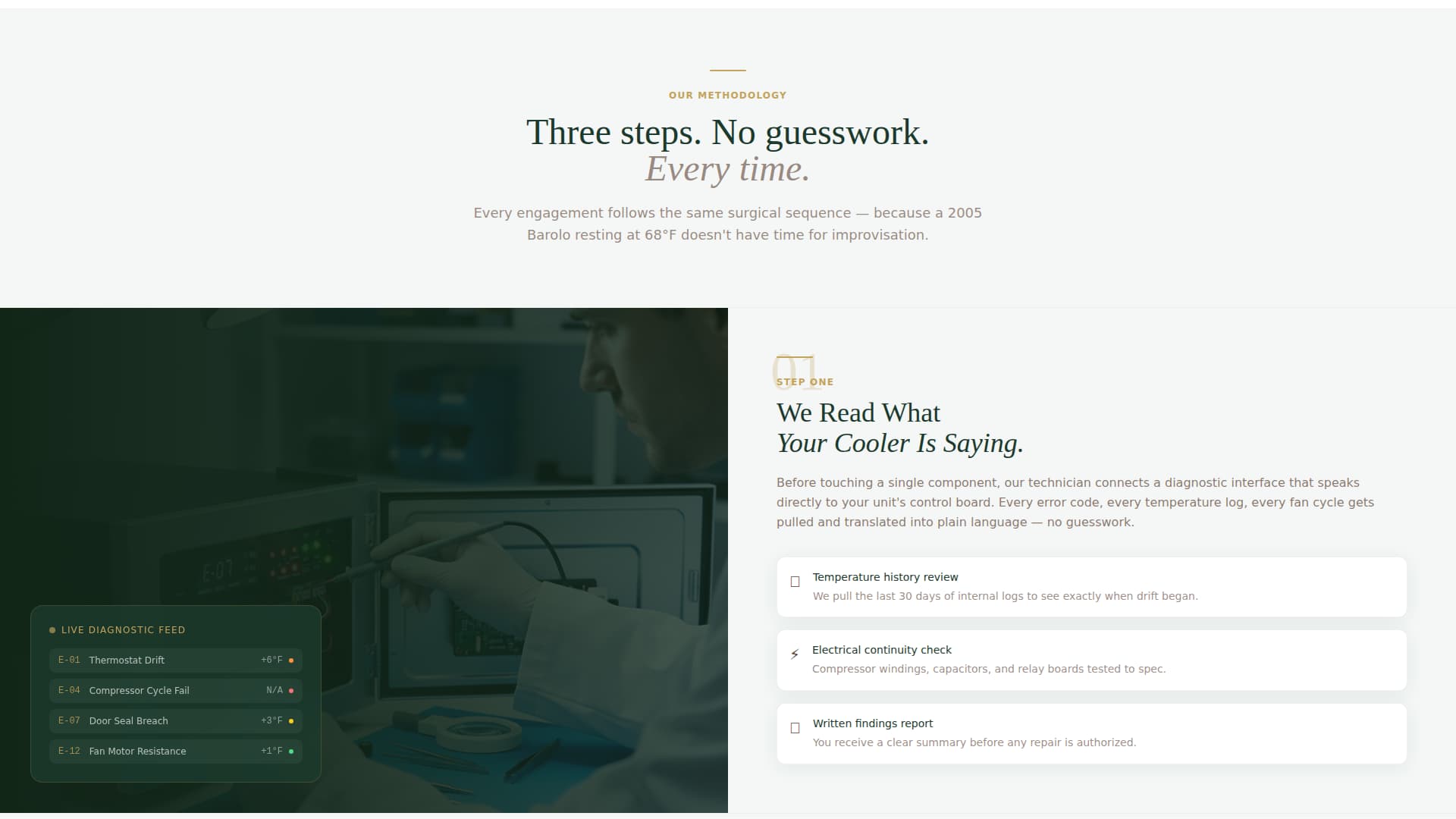 Many repair services lose potential clients because their pages feel generic. A visitor with a failing wine cooler needs reassurance, not a wall of text. They want to see that the technician understands the problem and follows a reliable process.