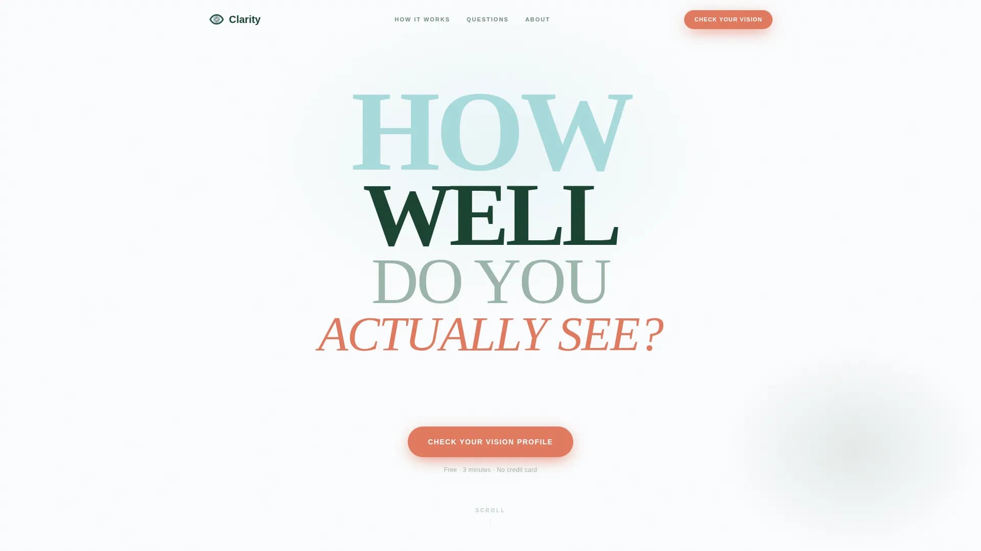 The hero uses four stacked lines of display type in distinct weights and colors, reading like an eye chart in reverse. The phrase builds from "HOW" down to "ACTUALLY SEE?" with a blinking cursor beneath inviting the first click. Negative space carries the composition without competing imagery.