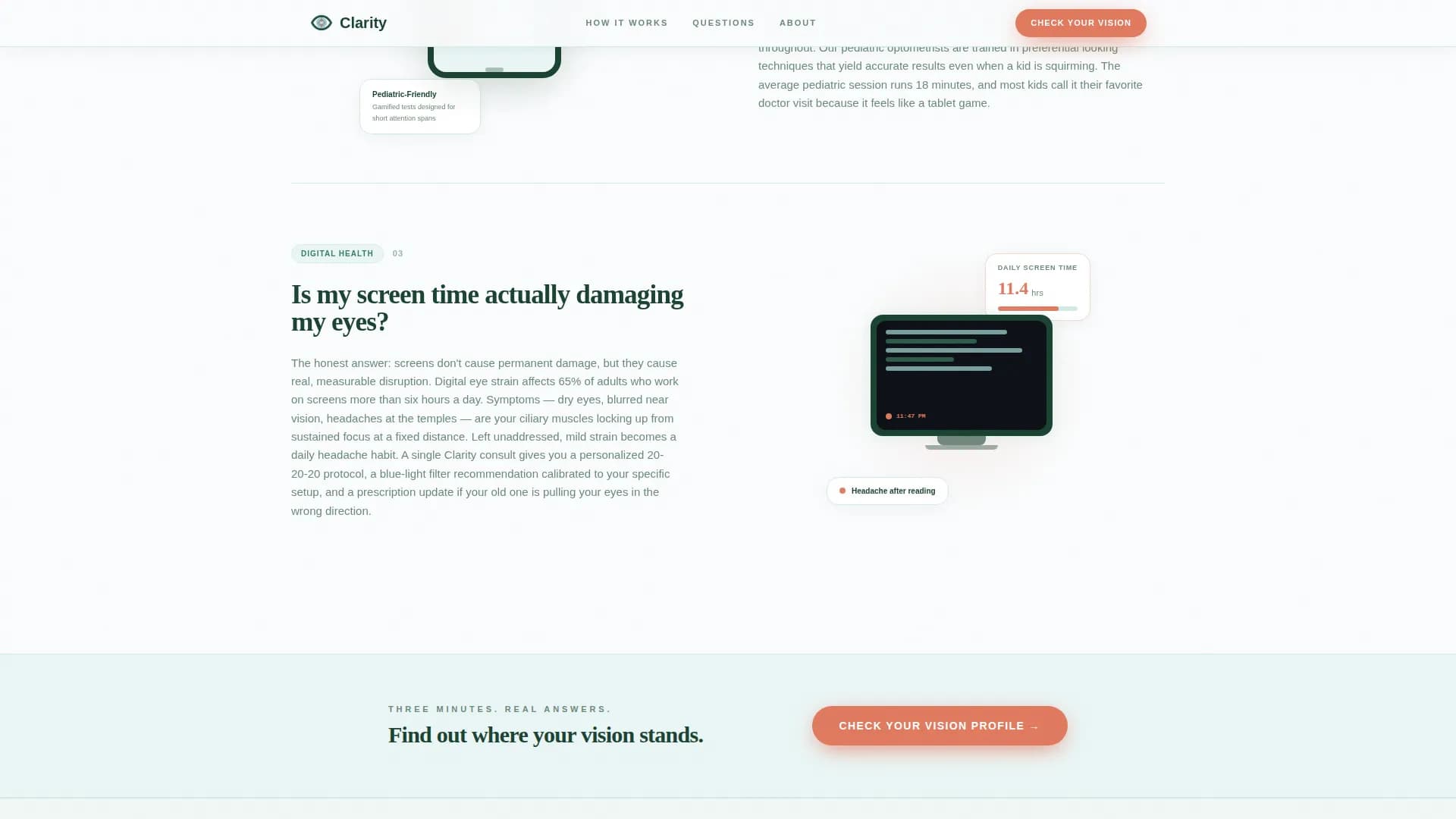 | call to action Quiz Break | Launches the "Check Your Vision Profile" five-step assessment modal |
