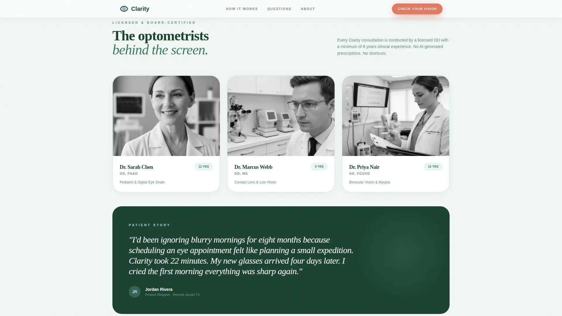 Clarity is a landing page template for virtual optometry consultations. It opens with a stacked typographic hero, moves visitors through patient-voiced FAQ sections in a zigzag layout, and closes with a five-step guided vision assessment that ends at a calendar booking screen. Every design choice supports one outcome: turning a first-time visitor into a qualified, scheduled patient.