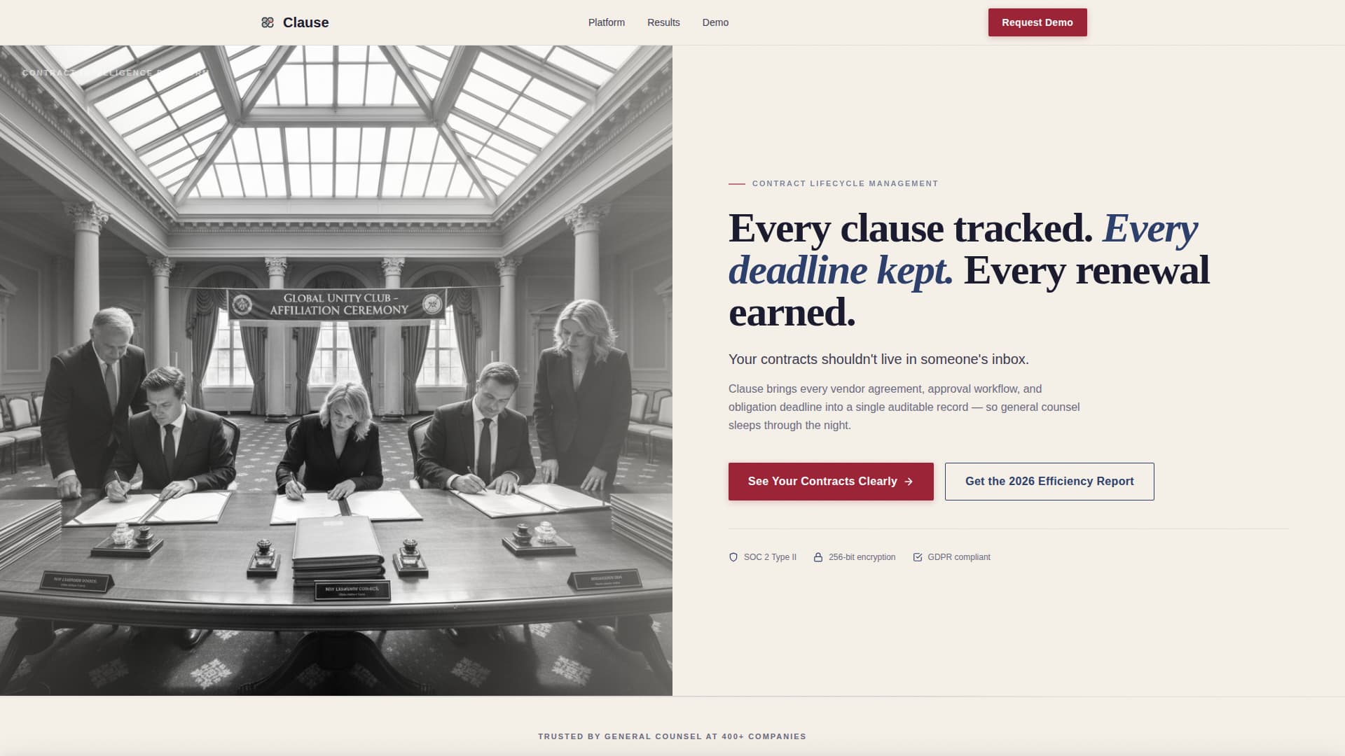 Clause is a single-column landing page template for a contract lifecycle management platform. It targets general counsel, procurement directors, and compliance officers at mid-market companies. The layout moves visitors through layered social proof, animated platform metrics, and a two-step lead generation form, all wrapped in a federal-courthouse editorial aesthetic.