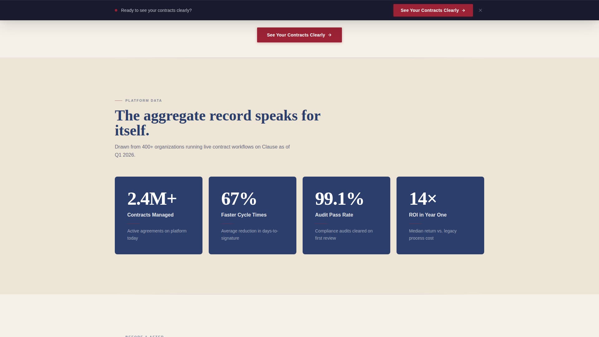 Scroll-triggered counters surface aggregate platform data, including contracts managed, average cycle-time reduction, and compliance audit pass rate. The numbers are revealed as the visitor scrolls, giving the data a sense of being earned rather than declared.