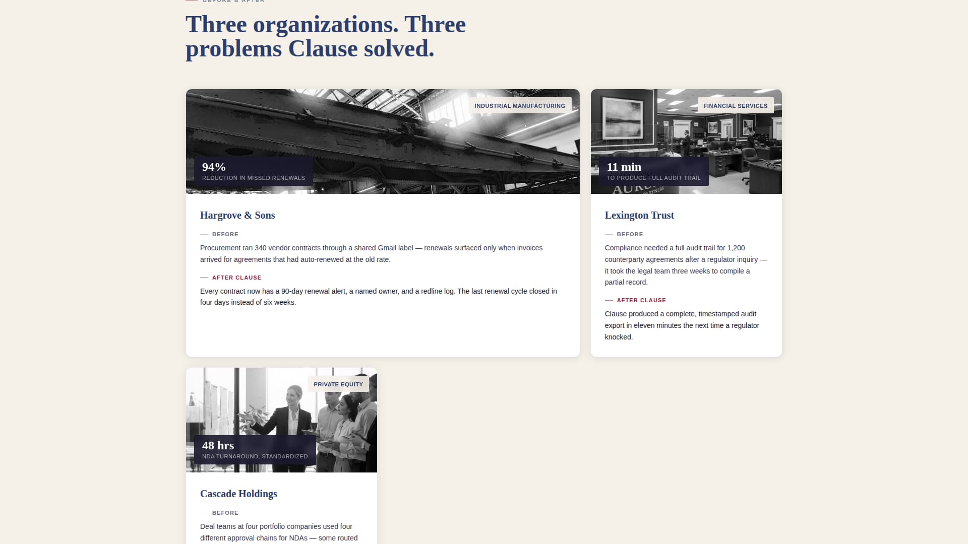 Three asymmetric bento-layout cards each tell a two-sentence before-and-after story. Each card names a real client scenario, making the platform's impact concrete and verifiable rather than abstract.