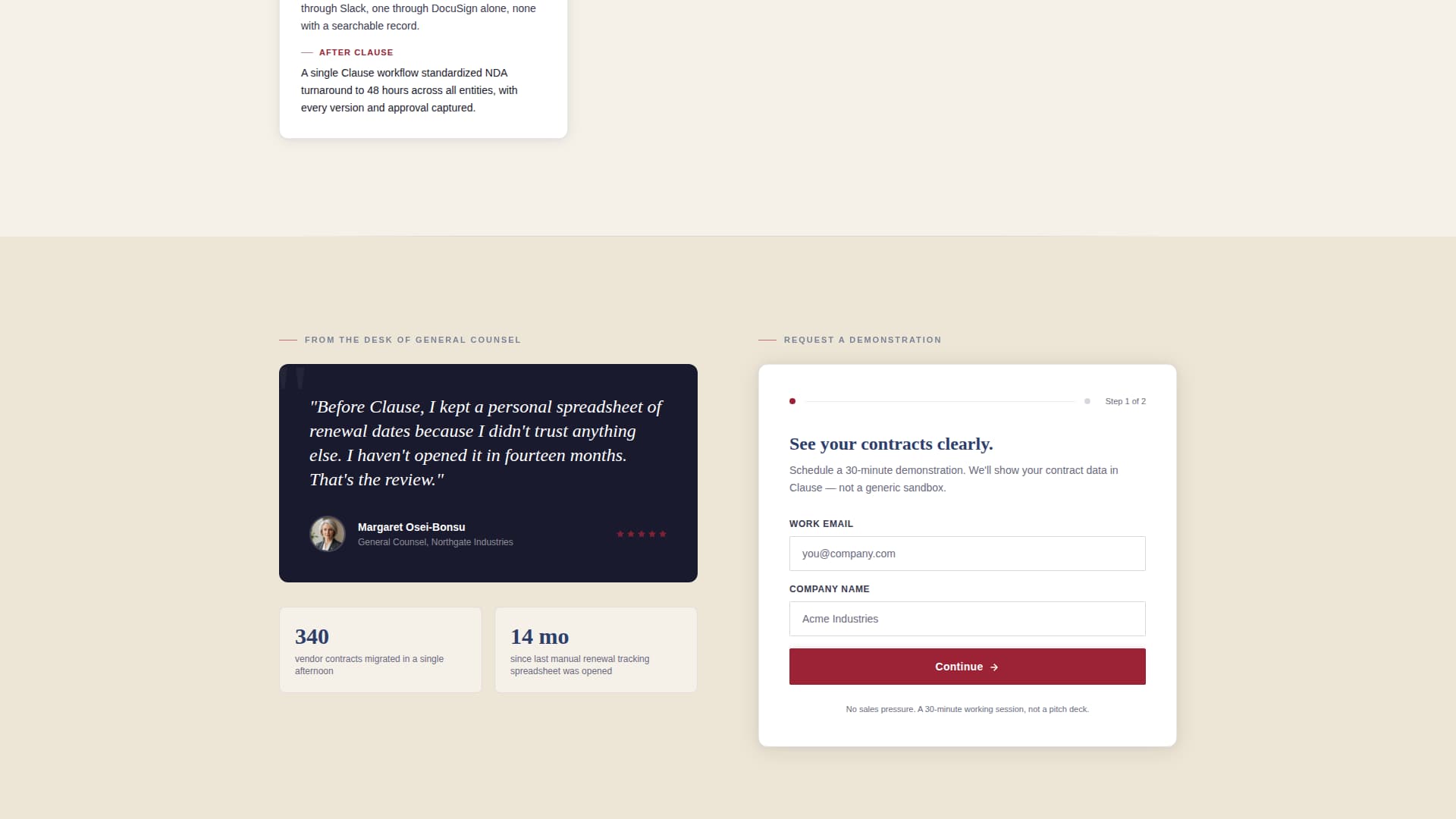 Clause is a contract lifecycle management landing page template built for legal and procurement teams at mid-market companies. It guides visitors from first impression through demo request using a single-column scroll, institutional editorial design, and a progressive two-step lead capture form. The layout pairs cinematic visual authority with layered social proof to earn trust before asking for a commitment.