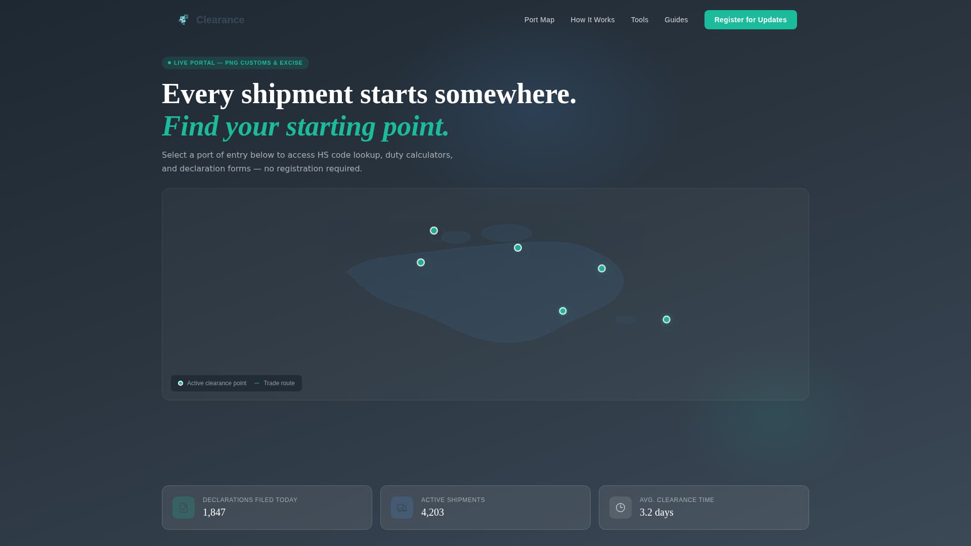 The hero is a top-down SVG map of the country's ports, bonded warehouses, and excise zones. Each active clearance point pulses with a teal node. Hovering reveals contextual options such as HS code lookup, duty calculator, and declaration forms for that specific port.