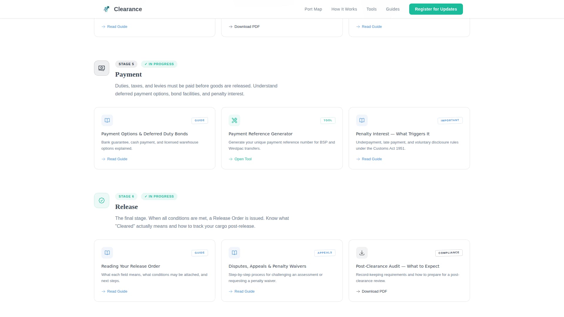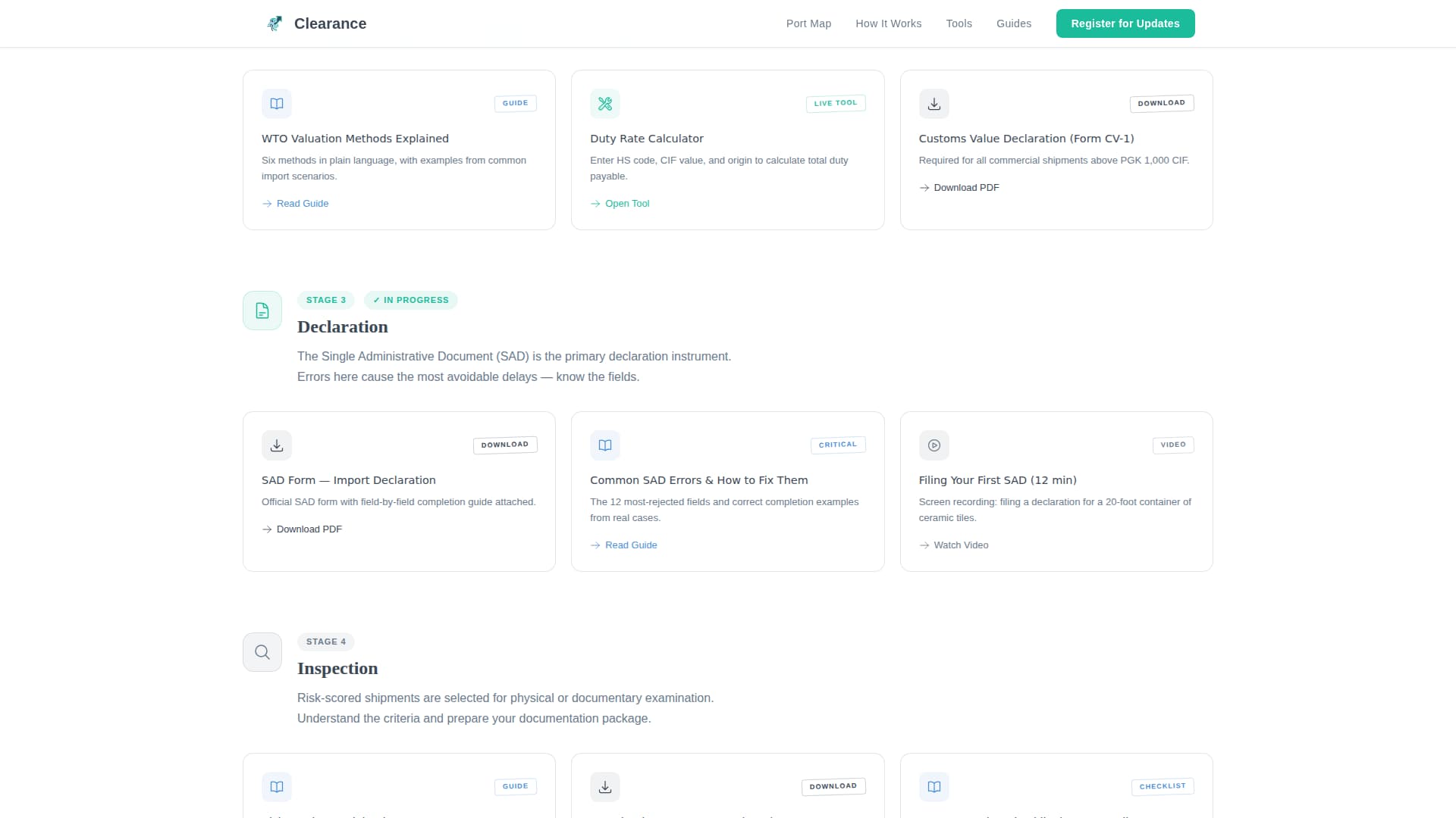 Each clearance stage, Classification, Valuation, Declaration, Inspection, Payment, and Release, is represented by its own section of modular cards. Cards break down into four types: written guides, interactive tools, downloadable forms, and short explainer videos. The layout escalates in complexity, moving from terminology basics in early cards to dispute handling and penalty waivers in later ones.