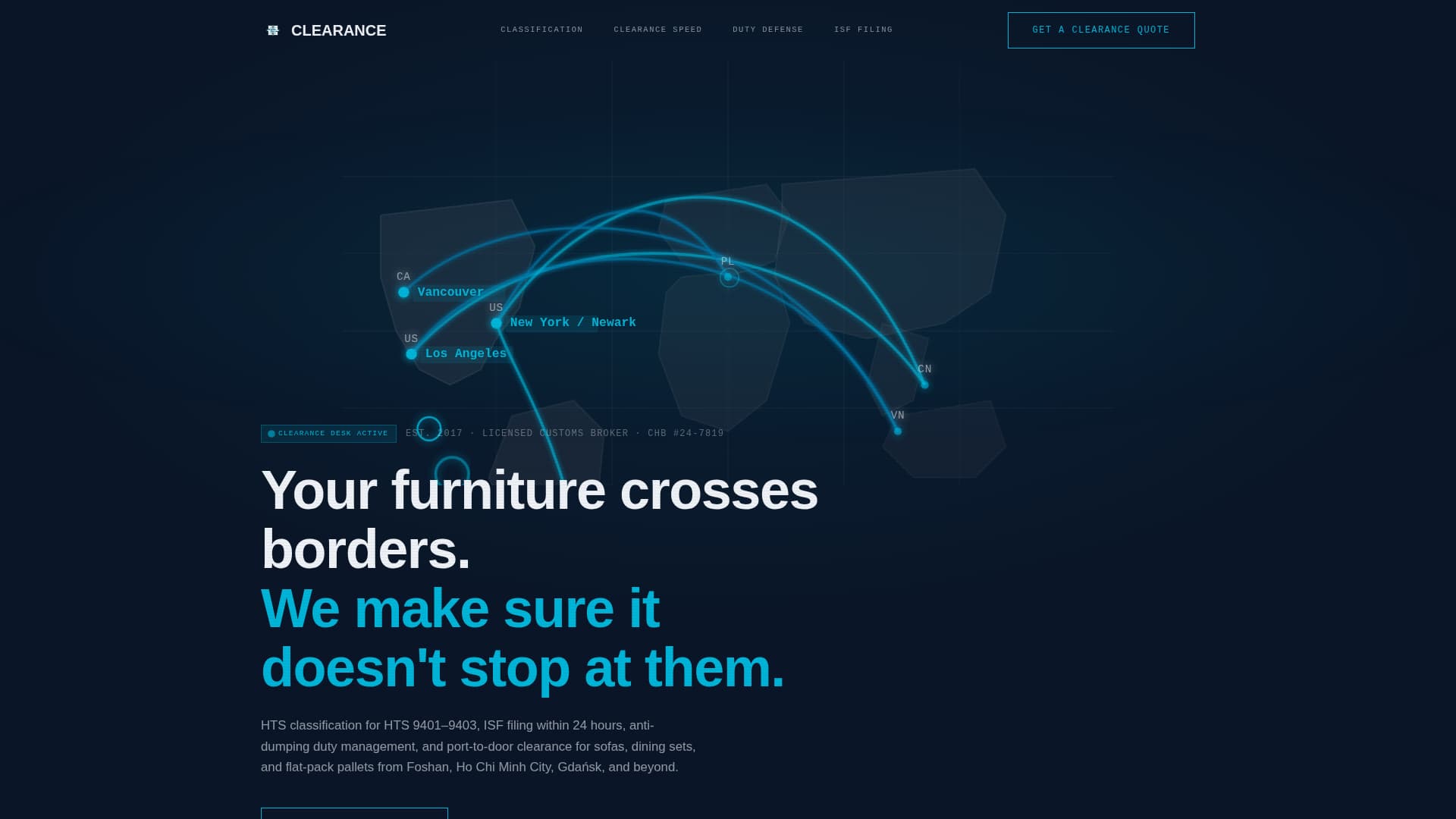 Clearance is a lead generation landing page built for furniture and household goods customs brokers. It combines an animated world map hero, zigzag spec-sheet sections, and a focused quote form to convert furniture importers and retail logistics managers into qualified leads. The Midnight Blue and teal color system gives the page an authoritative, port-authority feel from the first scroll.