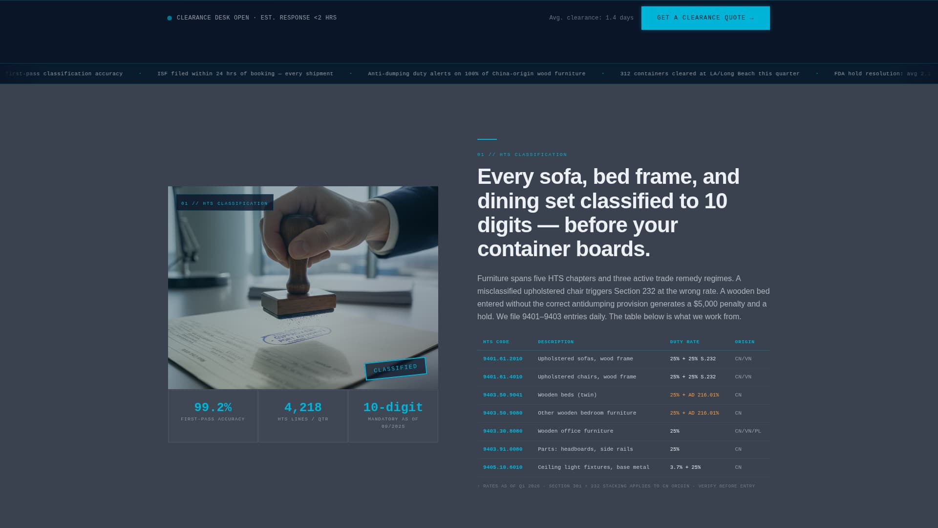 Furniture importers lose money when shipments stall. A generic brokerage page cannot prove it understands Harmonized Tariff Schedule (HTS) codes for sofas, anti-dumping duties on Chinese bedroom furniture, or Importer Security Filing (ISF) windows. This template solves the credibility gap.