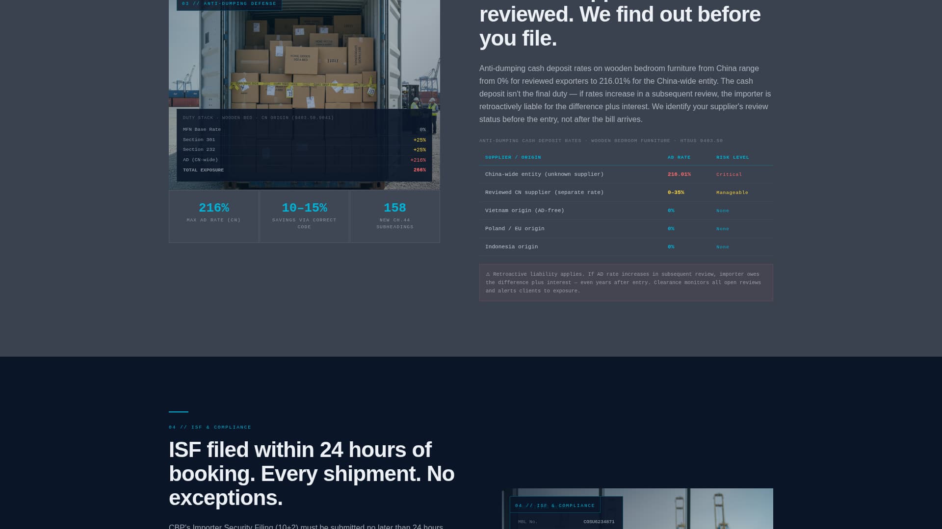 Instead of generic testimonials, each spec-sheet section uses formatted data tables and checklist components. These cover HTS classification accuracy rates, average clearance timelines, anti-dumping duty savings figures, and ISF filing windows.