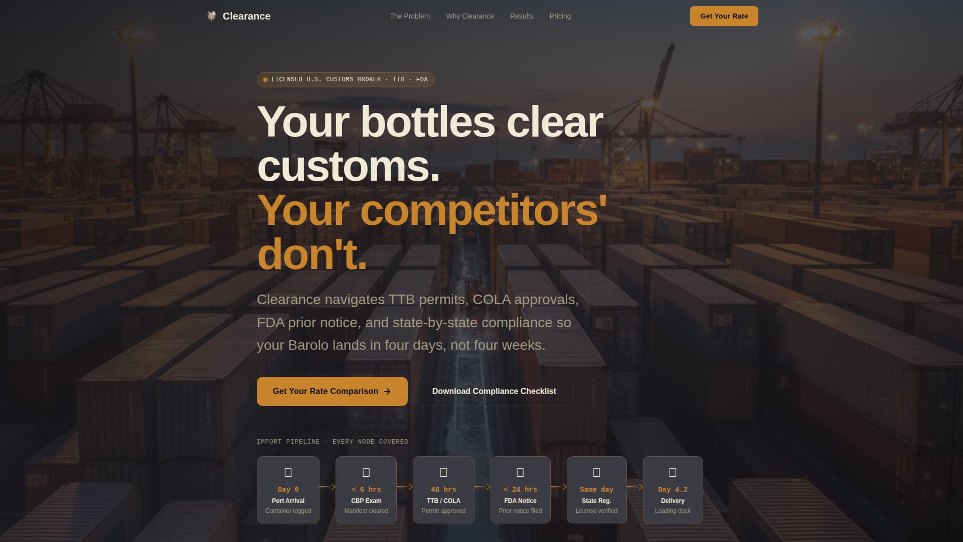 Clearance is a conversion-focused landing page template designed for wine and spirits customs brokers. It opens with an isometric import pipeline illustration, anchors every section in compliance statistics, and drives visitors toward a rate comparison request. The layout is a single-column flow built around a Stats-First approach and a Comparison/Versus conversion path.