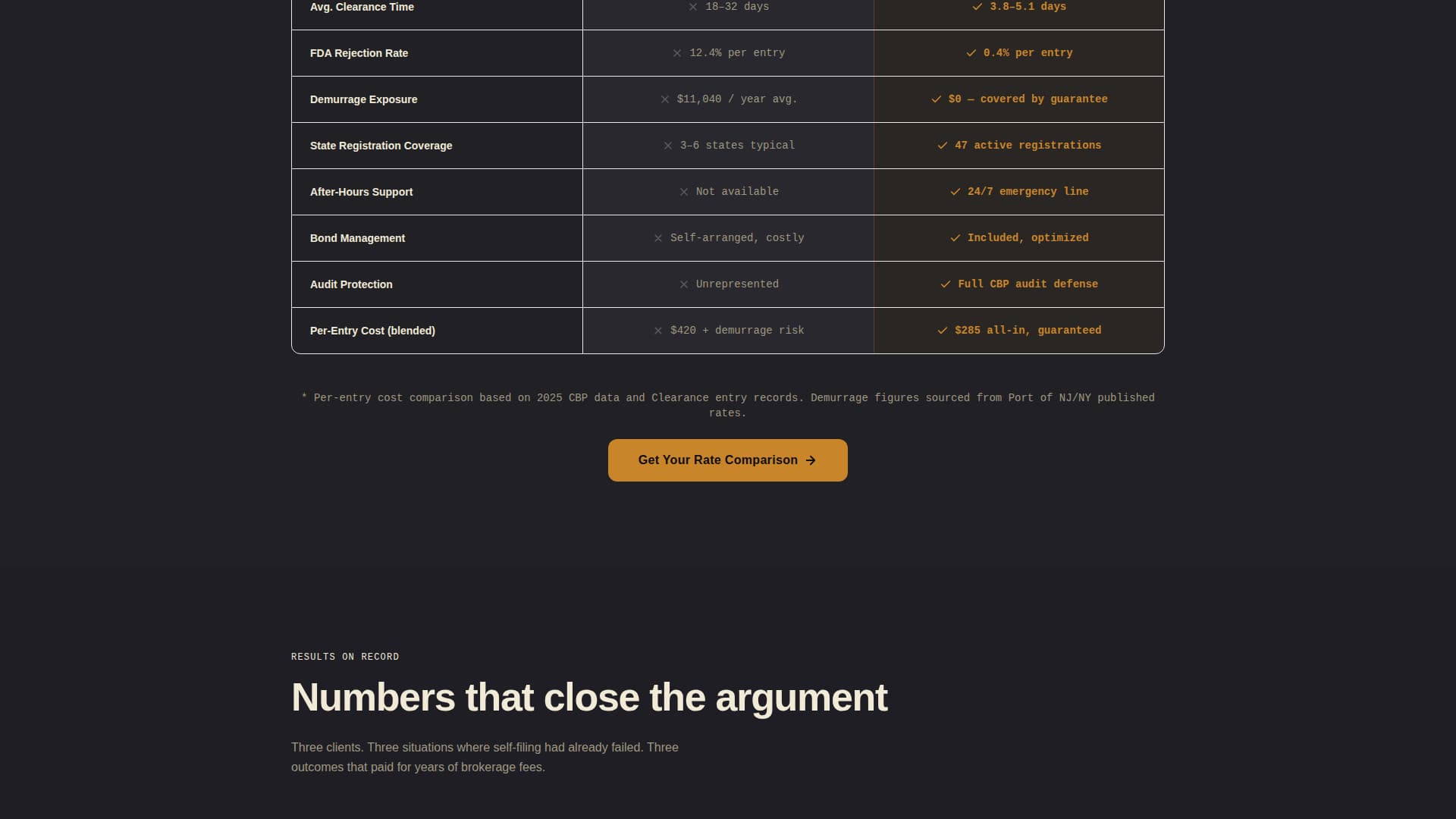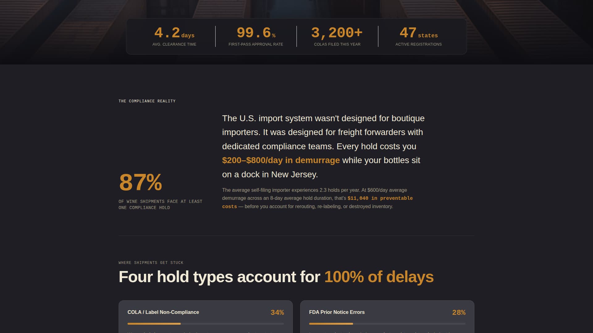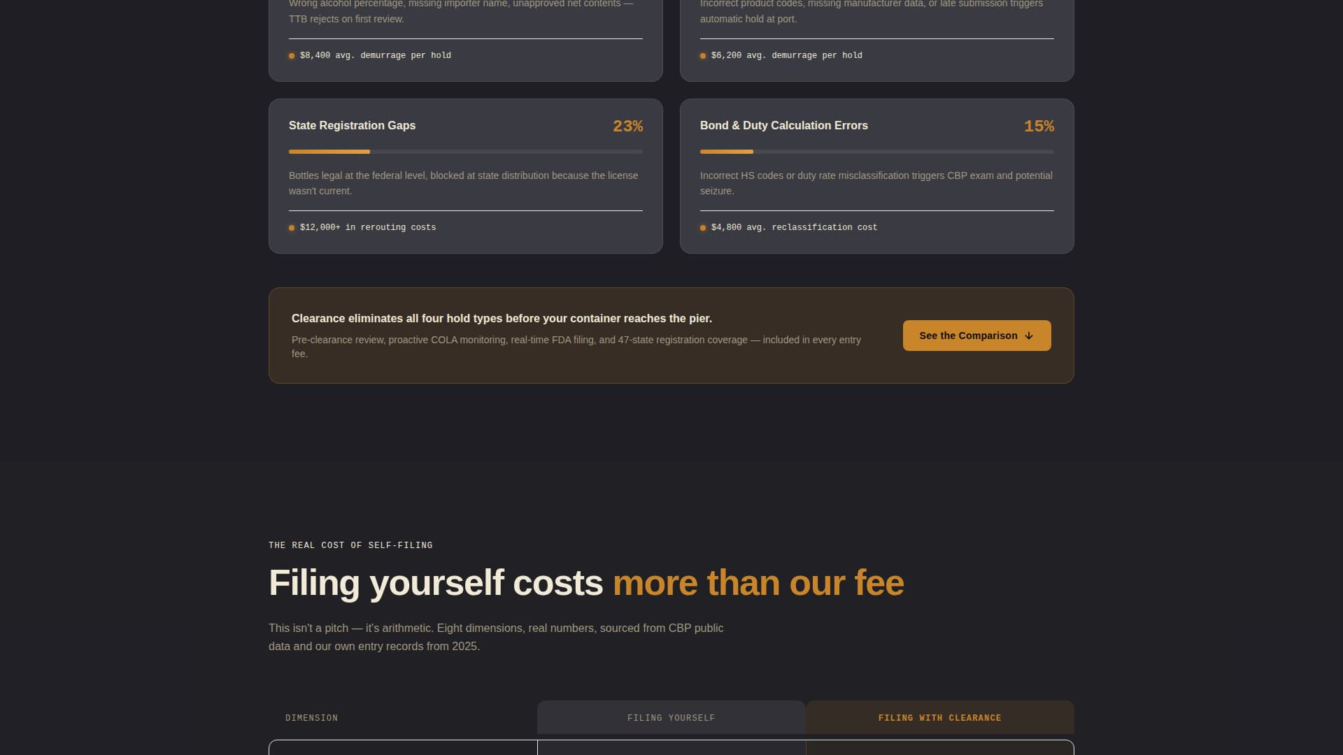 Clearance is a single-column landing page template built for wine and spirits customs brokers. It leads with hard compliance data, walks visitors through a self-filing versus broker comparison, and closes with a focused lead-capture form. The charcoal and amber design system communicates authority and precision from the first scroll.