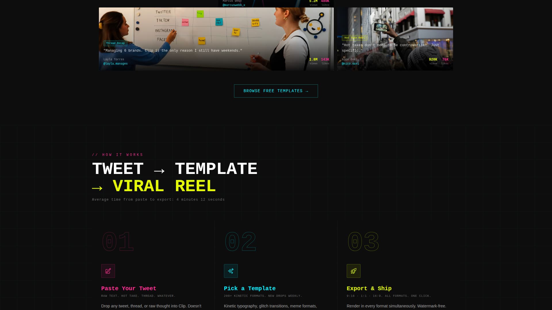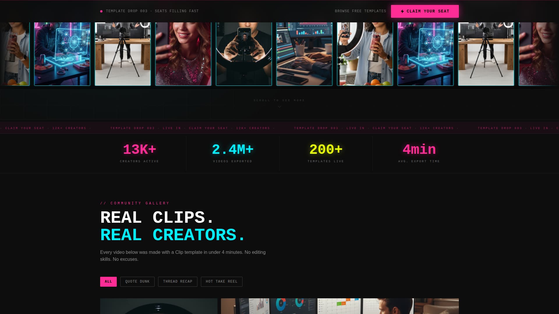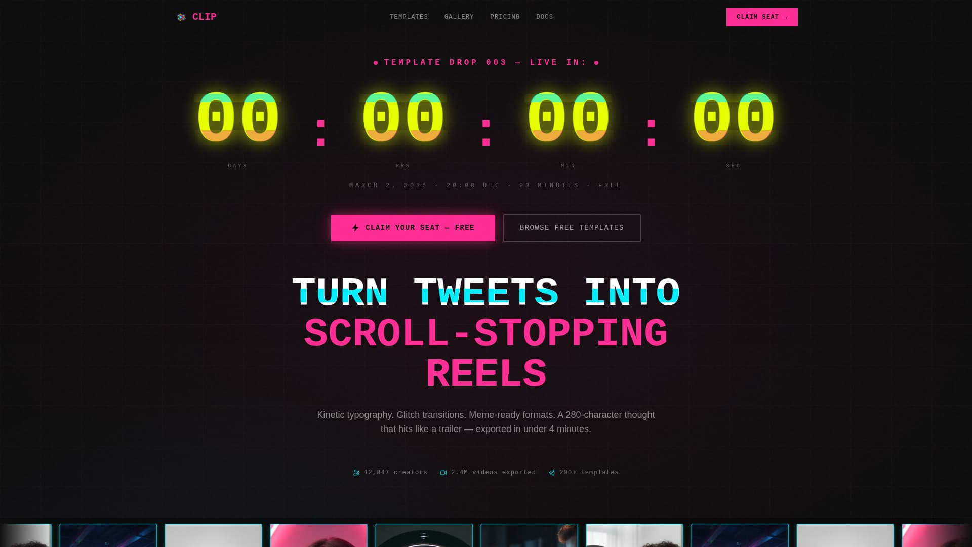Clip is a full-width immersive landing page template built for short video and reel creators who turn tweets and hot takes into scroll-stopping content. With a live countdown timer header, a community video gallery, and a punchy event registration flow, this Neo-Retro template delivers electric energy and clear conversion mechanics from the first frame to the final call to action.