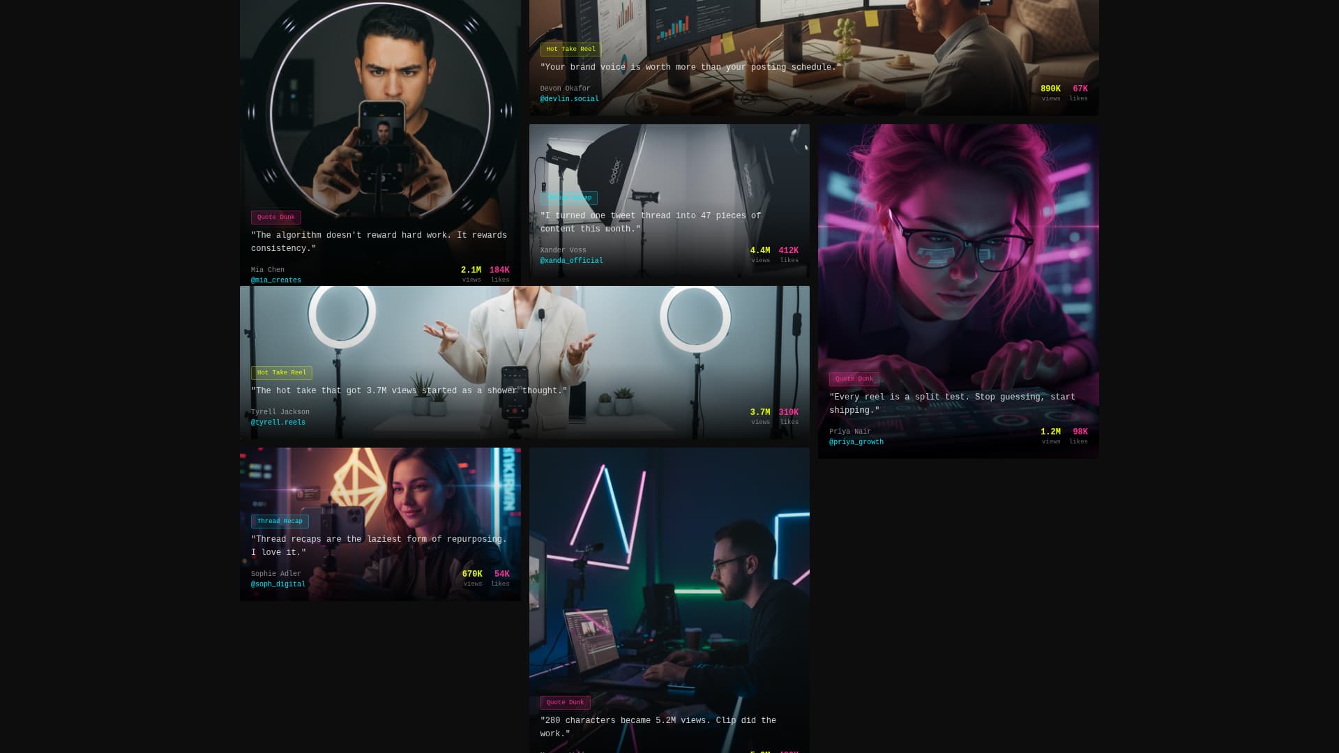 A masonry grid of real videos made with the templates scrolls below the header. Each thumbnail pulses with a cyan border on hover and expands into an inline player. Rows are tagged by format, including Quote Dunks, Thread Recaps, and Hot Take Reels, so visitors understand the range instantly.