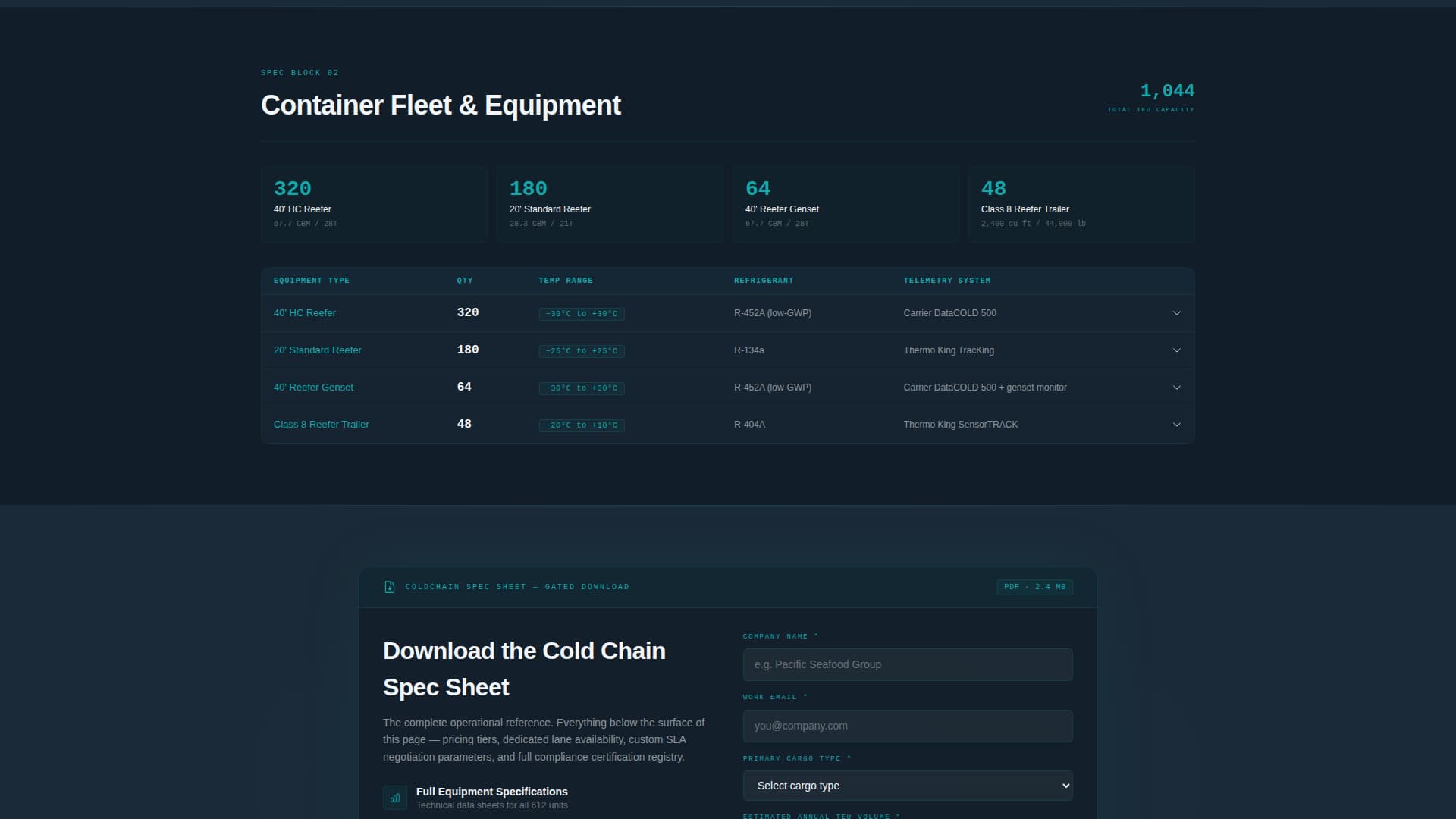 A mid-page call-to-action section gates the downloadable cold chain spec sheet behind a short form. The form collects company name, a cargo type dropdown with four categories, and estimated annual TEU (twenty-foot equivalent unit) volume. The same call to action repeats at the bottom of the page.