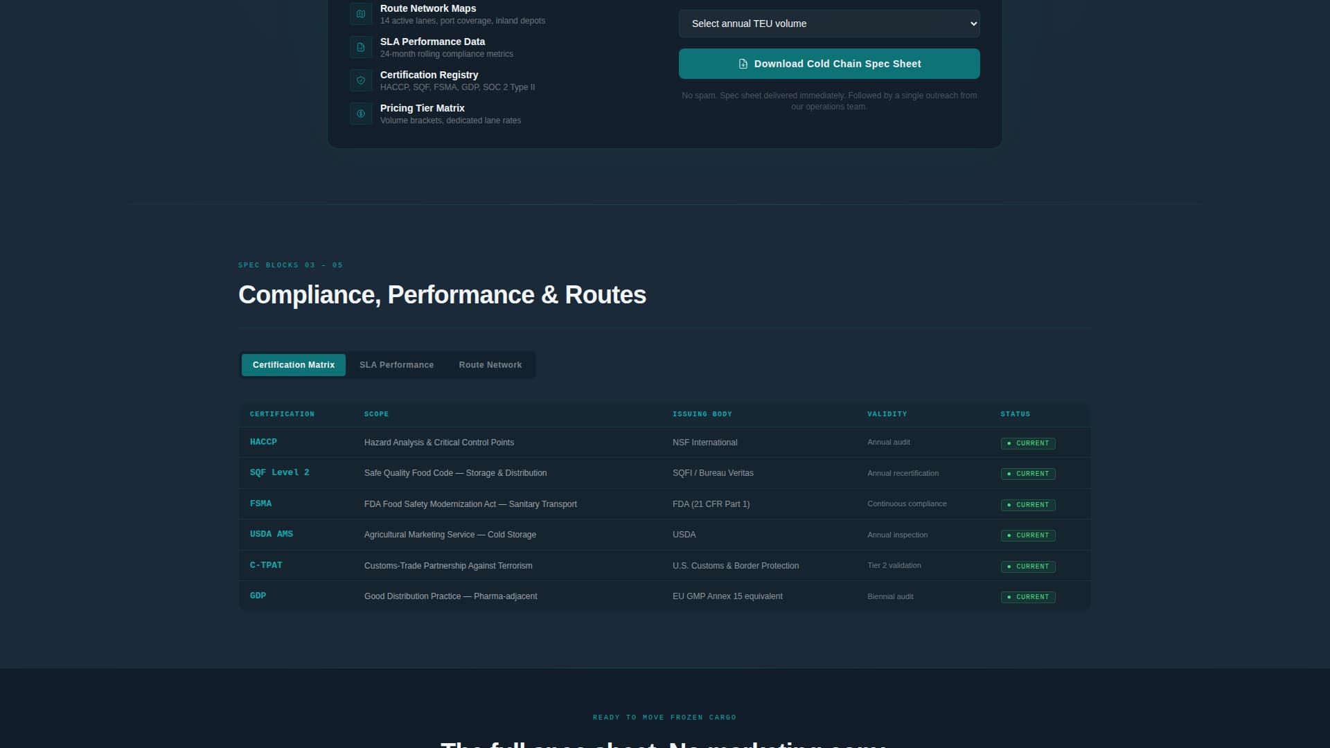 Buyers of frozen freight services arrive with high anxiety and specific technical questions. A generic logistics page cannot answer them. This template gives freight forwarders a page that speaks the buyer's language from the first scroll.