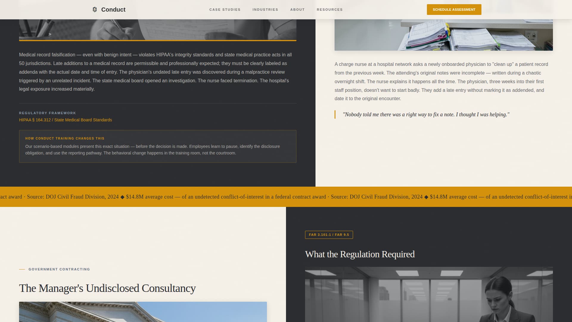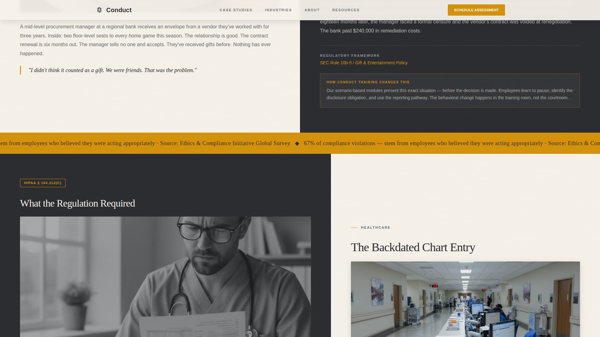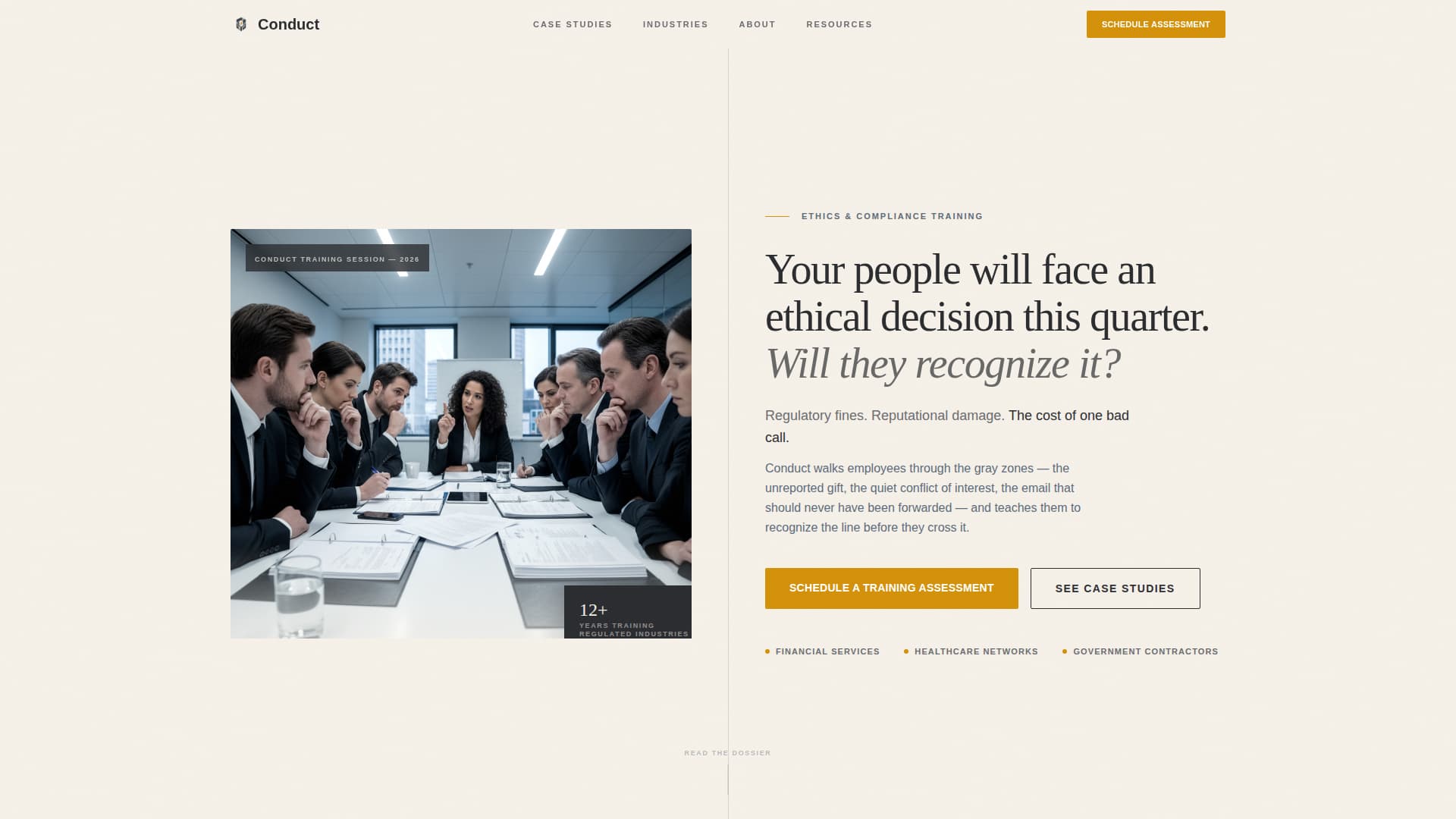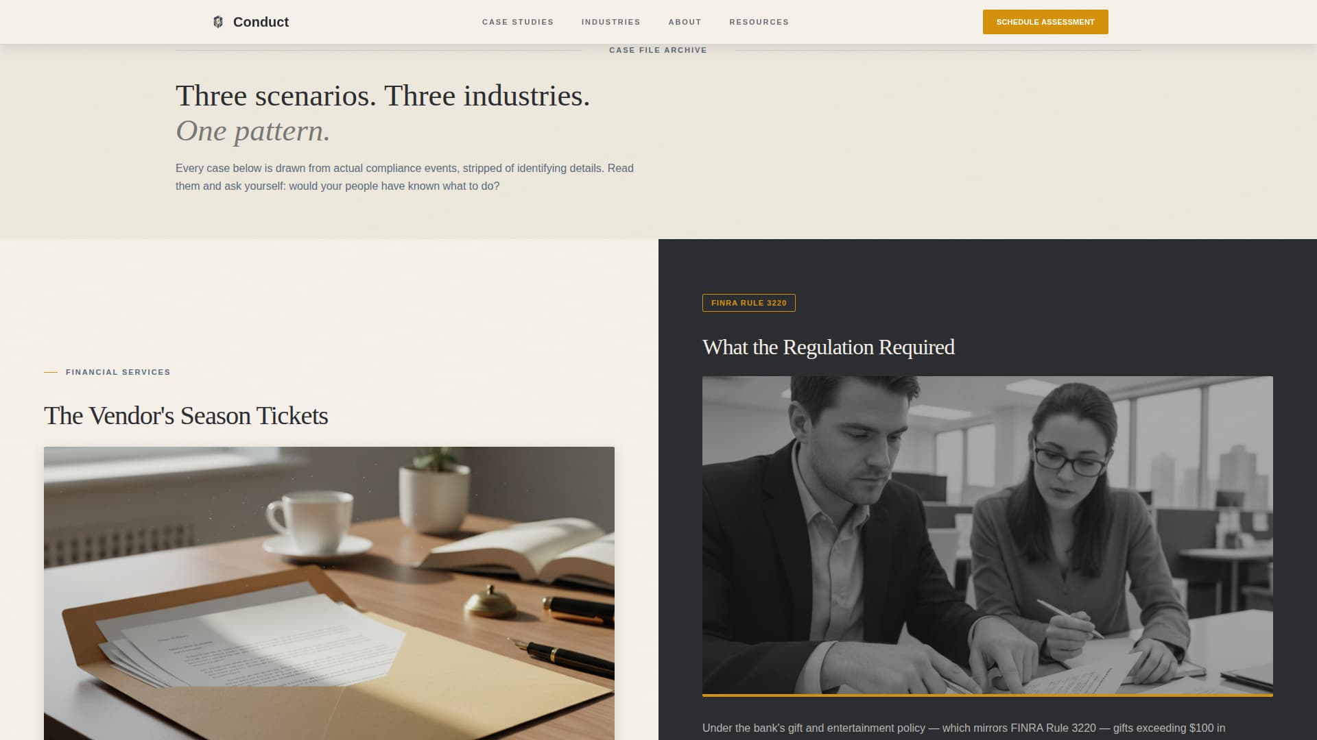 Conduct is an ethics and compliance training landing page built for regulated industries. It uses a zigzag case study layout to walk visitors through real-world workplace dilemmas, then guides them toward booking a training assessment. The institutional Civic Service design and scenario-led structure speak directly to compliance officers, HR directors, and general counsel.