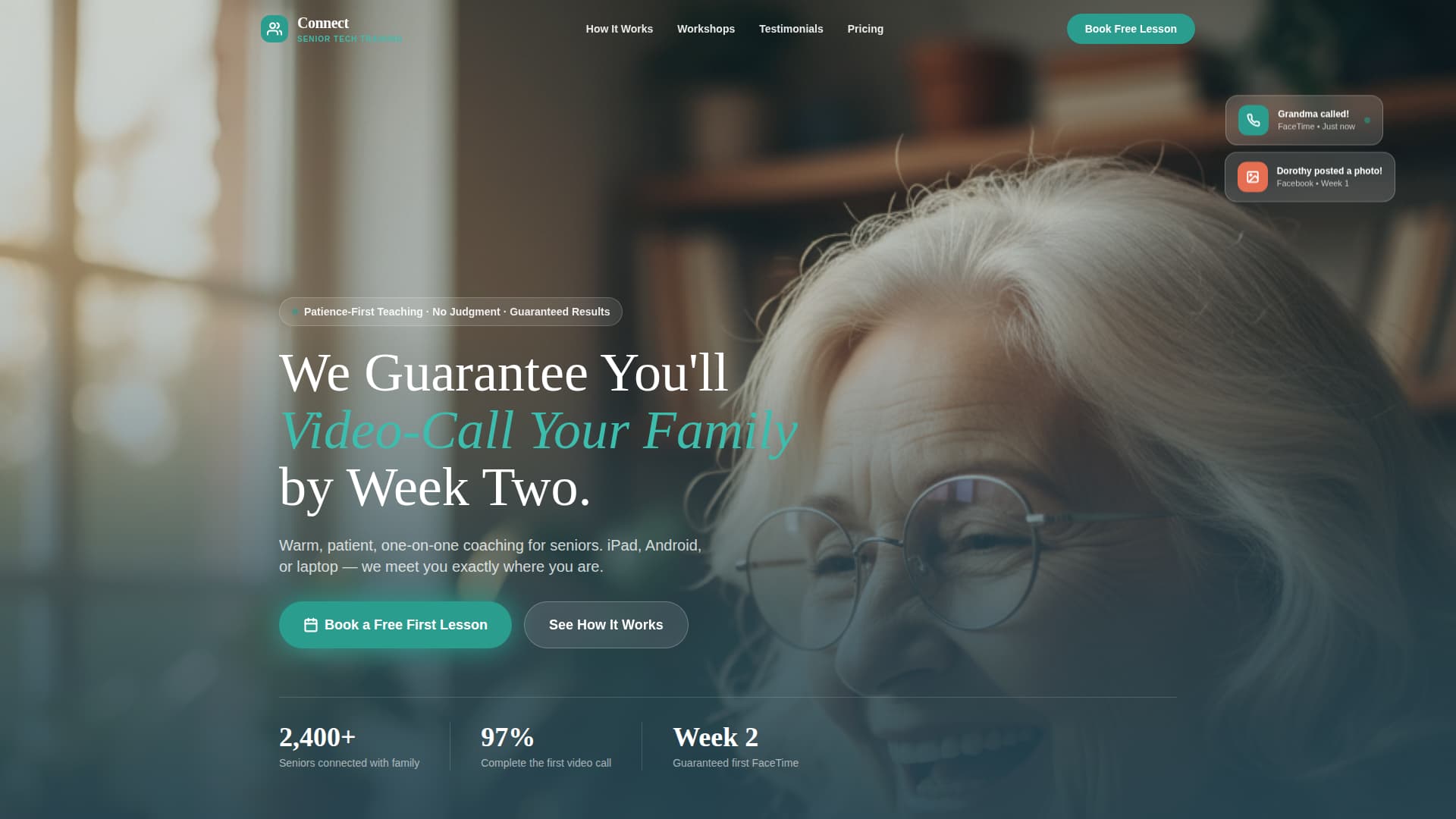 Connect is a single-page, card-grid landing page template for senior social media training services. It leads with a guarantee, builds trust through testimonial cards and illustrated guides, and drives bookings with a teal "Book a Free First Lesson" button. The warm Family First palette keeps every section approachable for older learners and the family members searching on their behalf.