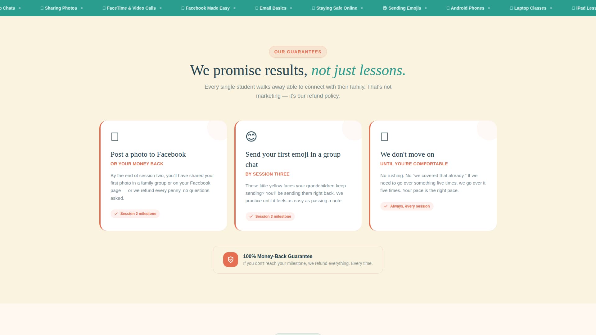 | Guarantee card row | Three coral-bordered cards state concrete promises before any methodology is introduced |