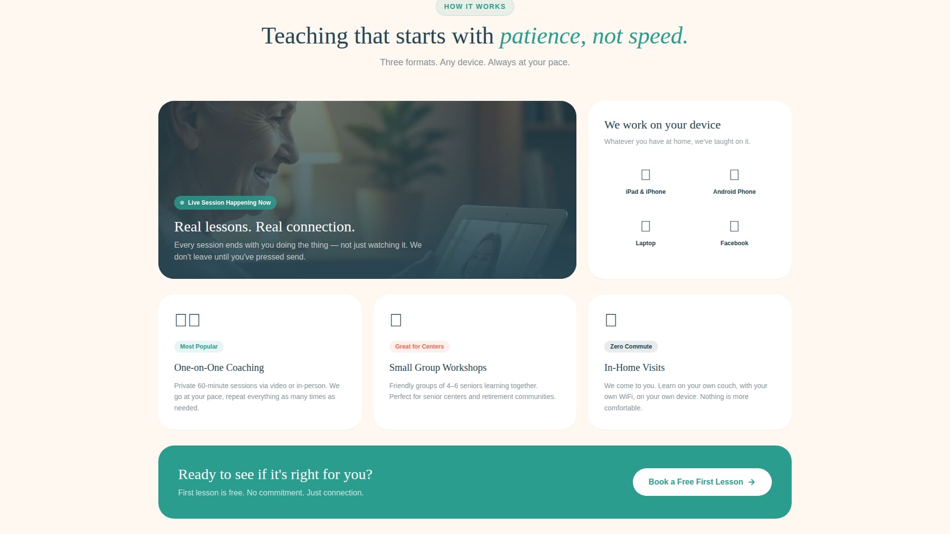 | Coaching approach cards | Highlight patience-first, one-on-one coaching and device-specific guidance |